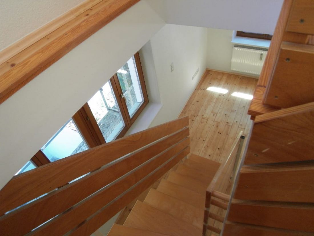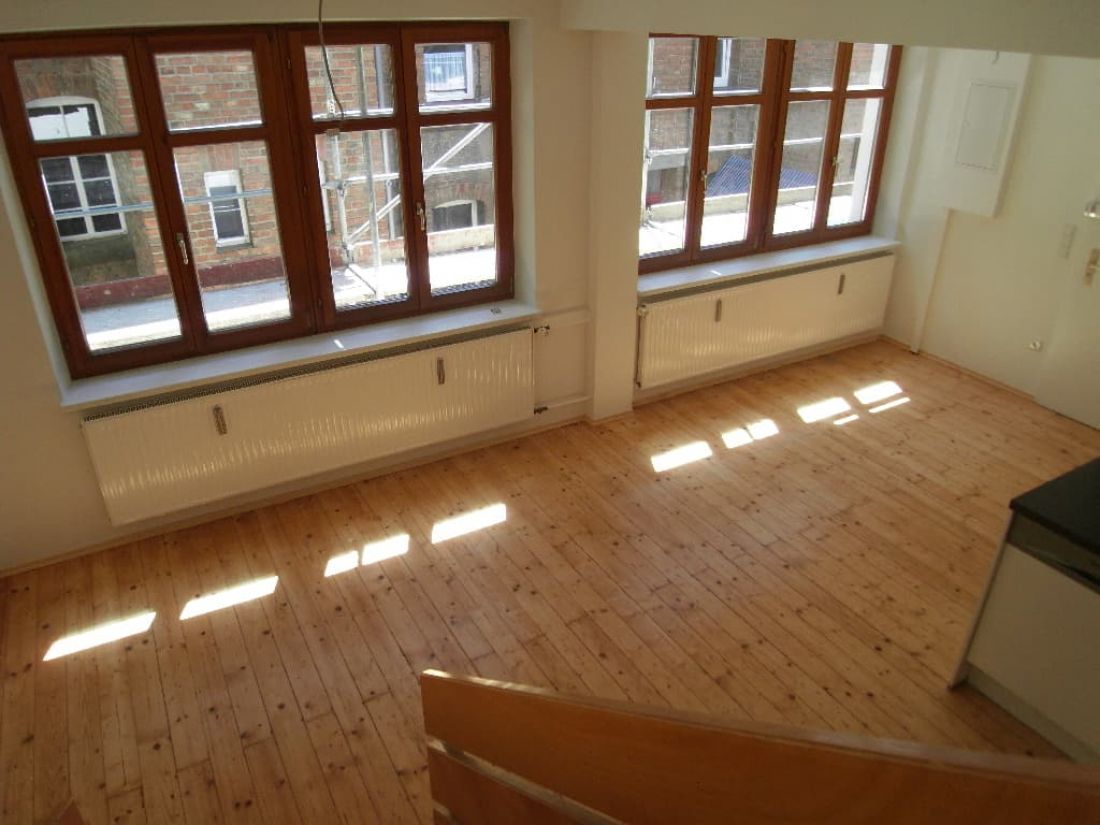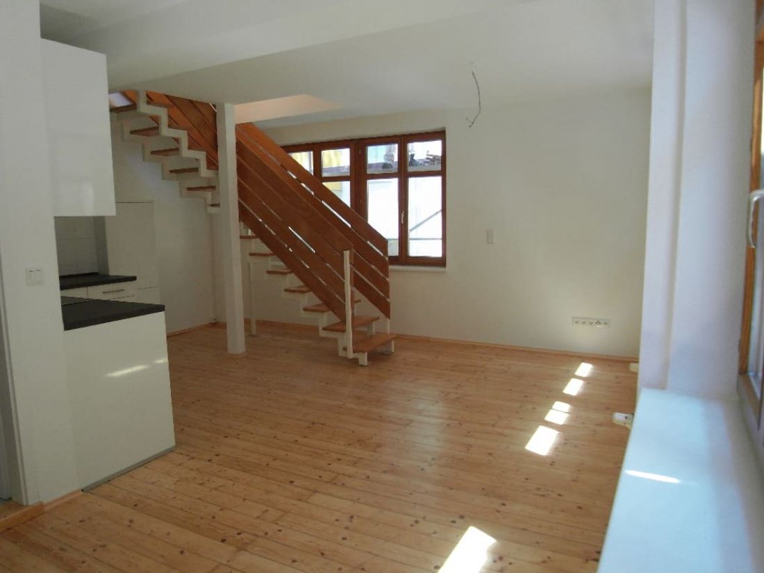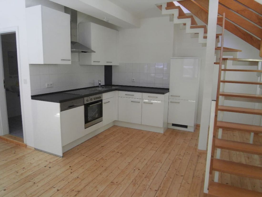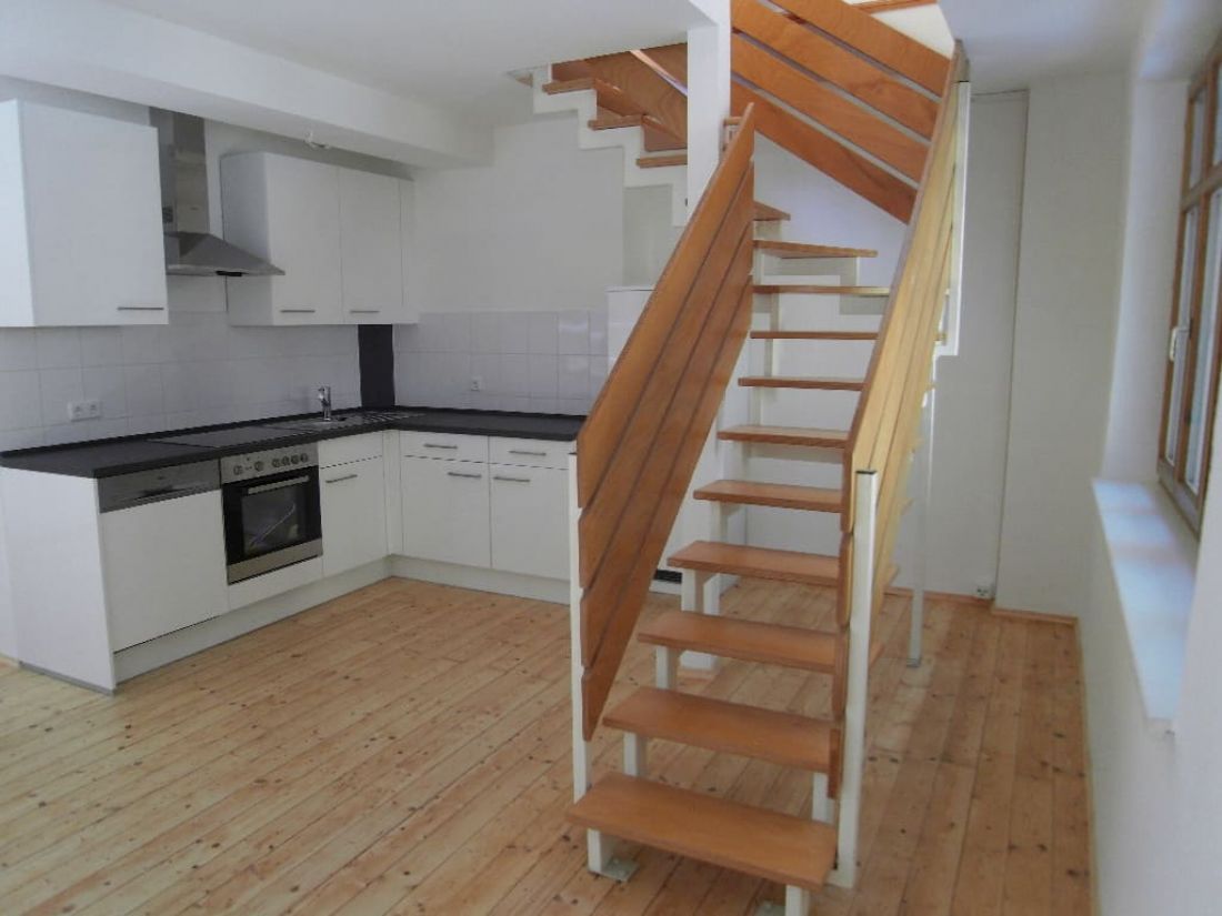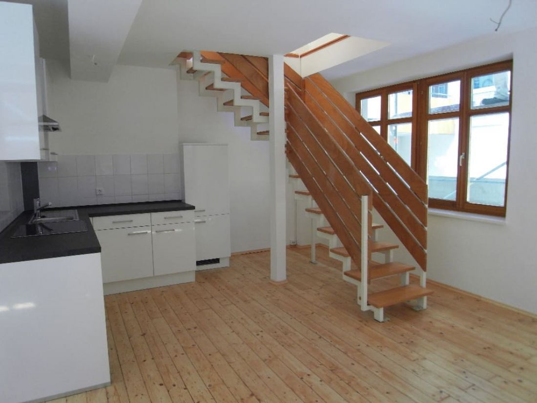 Die Einheit im Loftstil verfügt über einen offen gestalteten von Tageslicht verwöhnten Wohnbereich mit offener Küche - verbunden über eine Treppe mit dem darüber liegenden Studio.