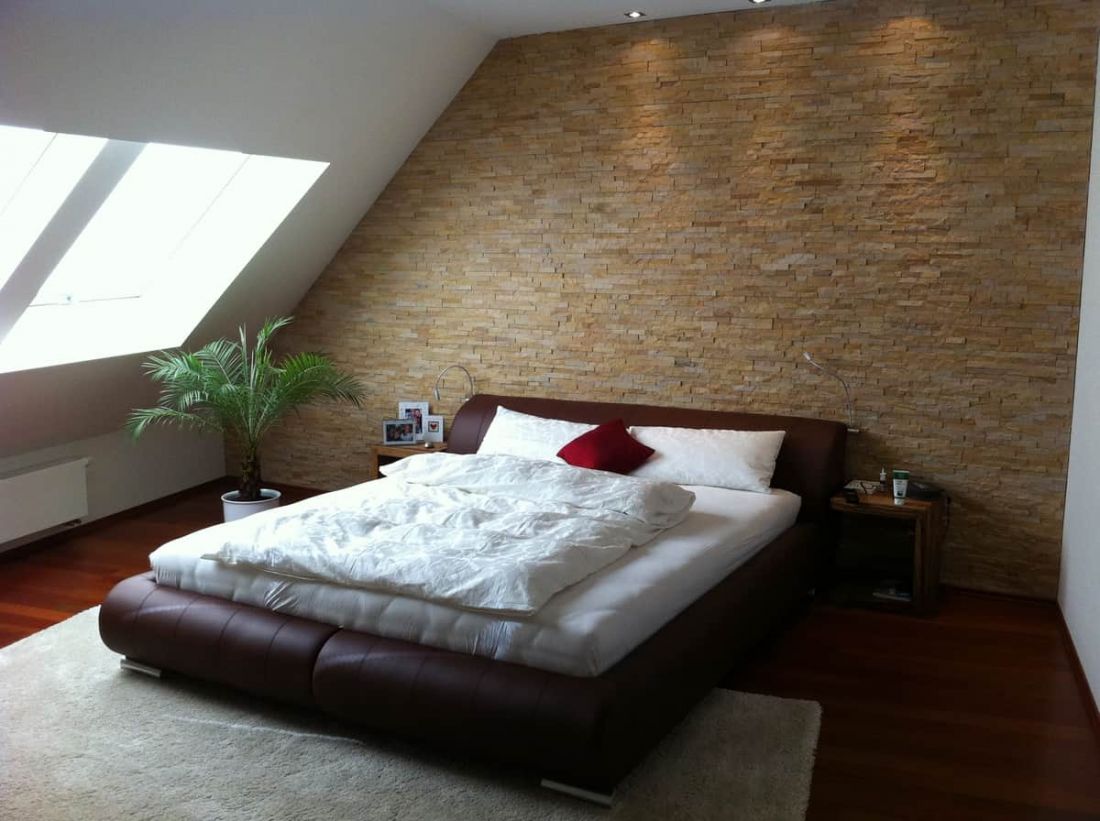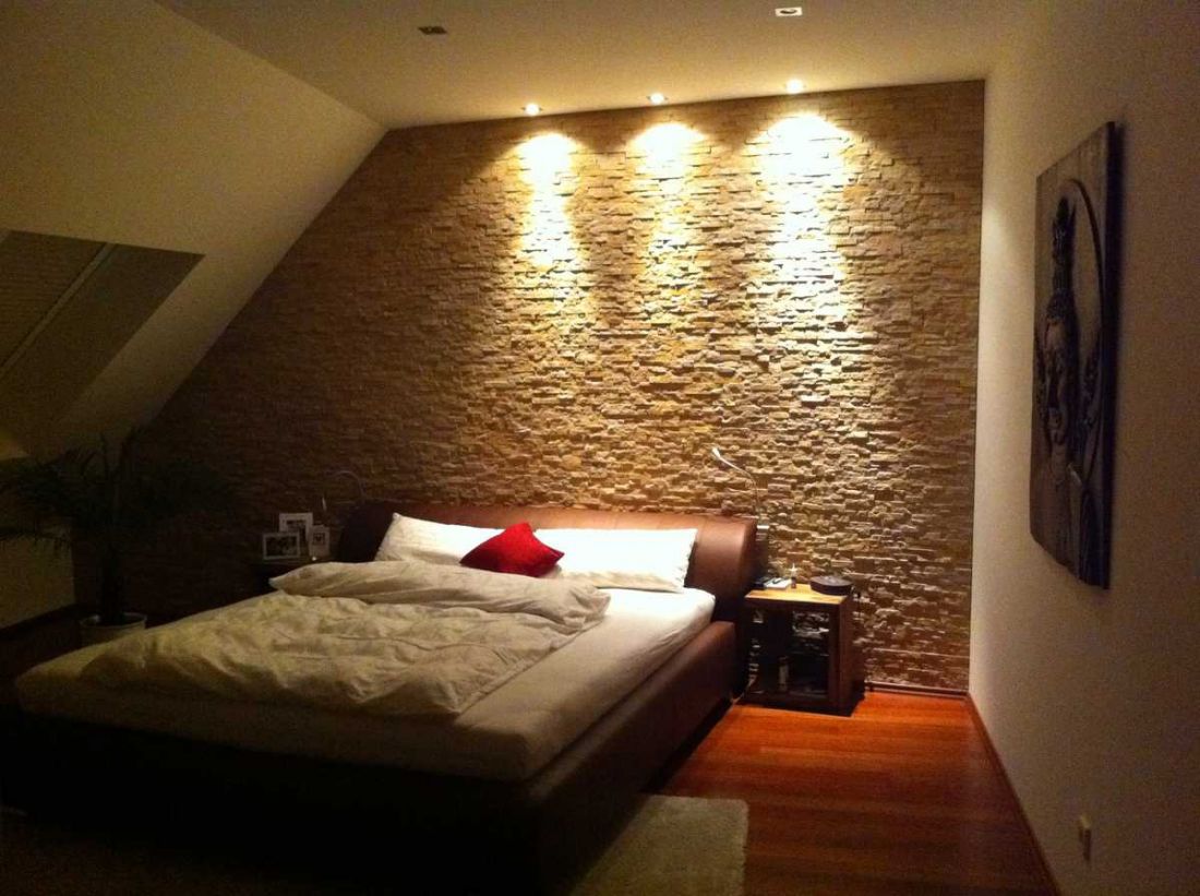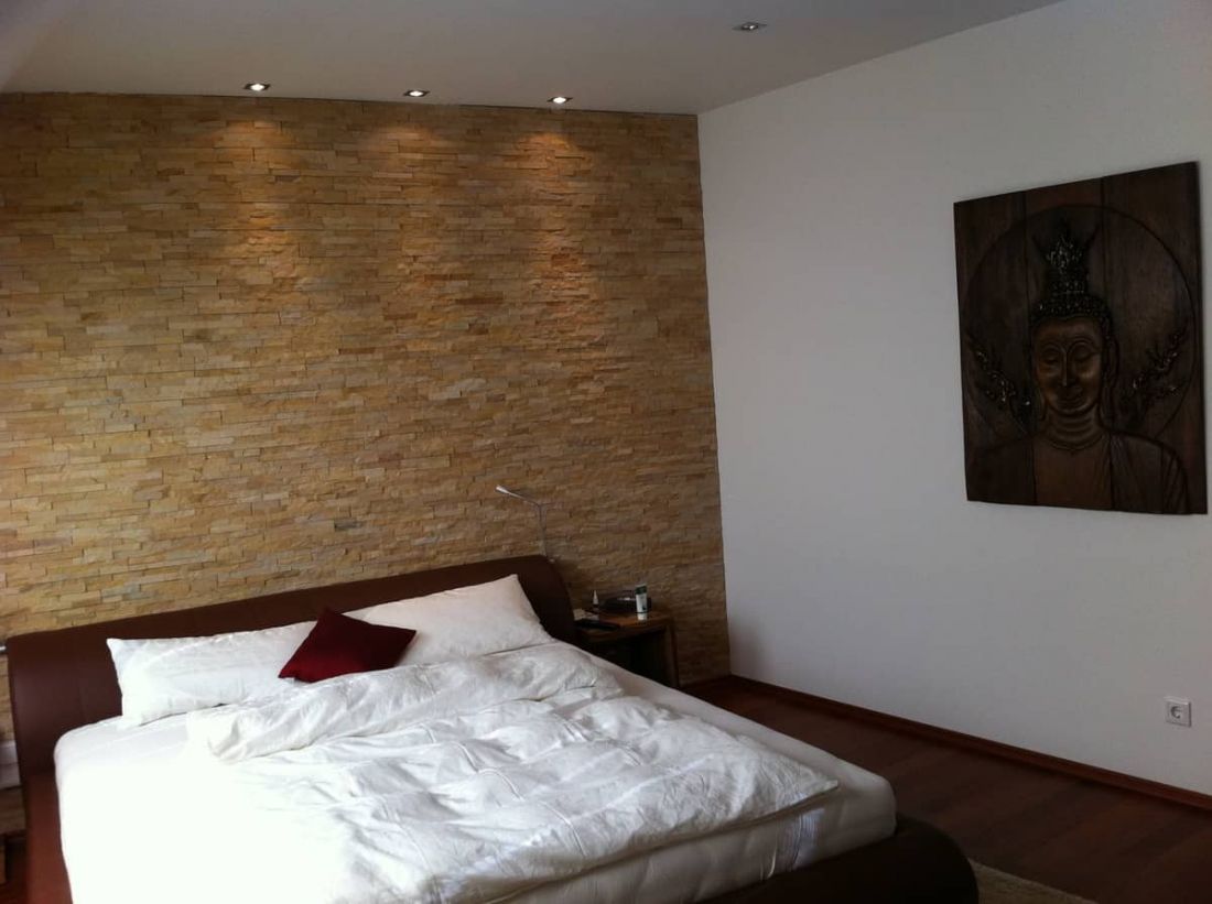 • Natursteinwand im Schlafzimmer