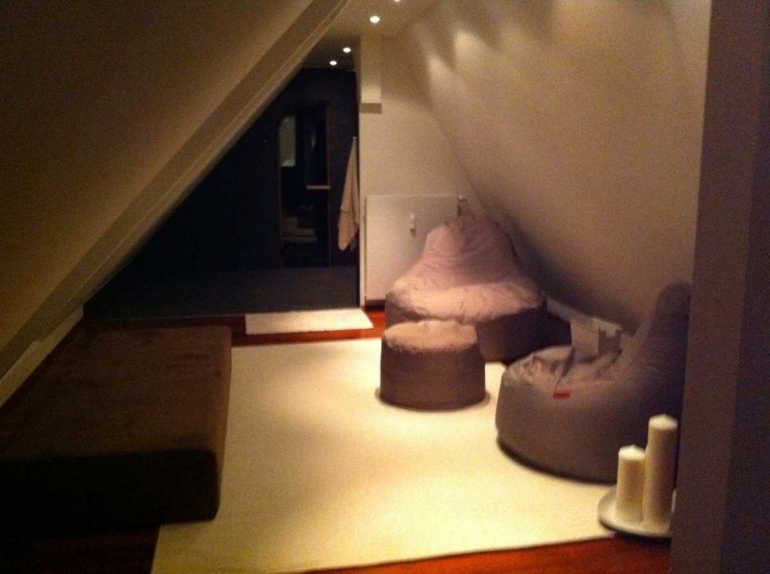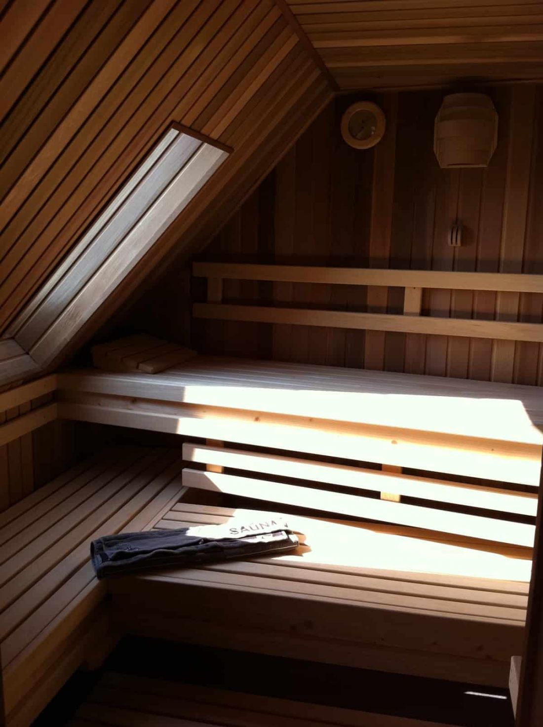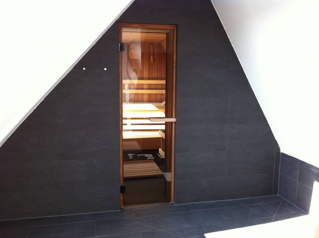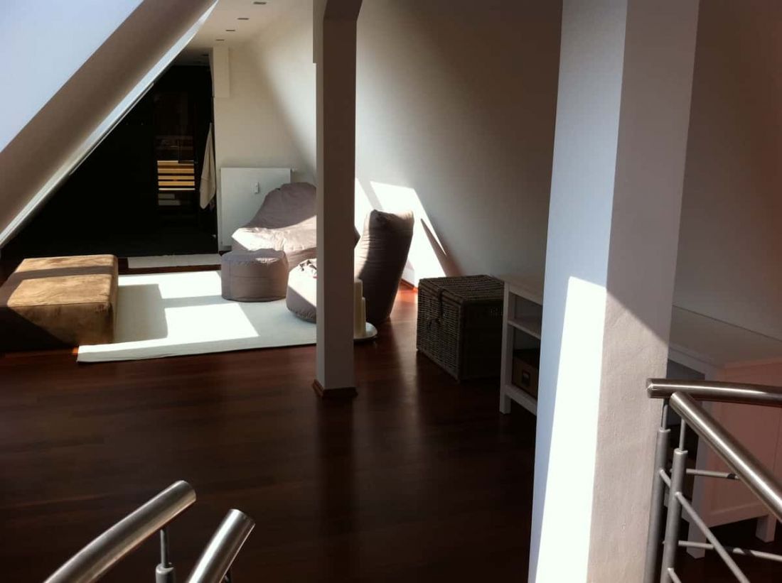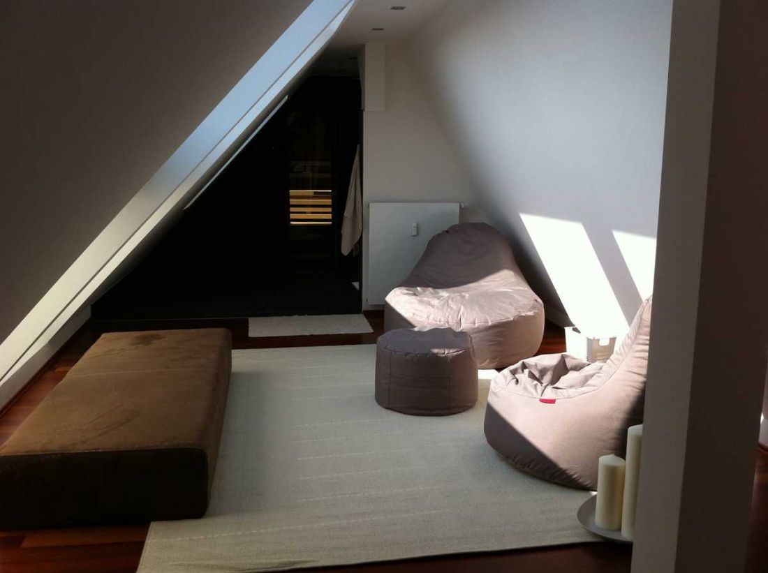 In der obersten Ebene, der Galerie, befinden sich die Sauna sowie eine „Raindance-Dusche“.