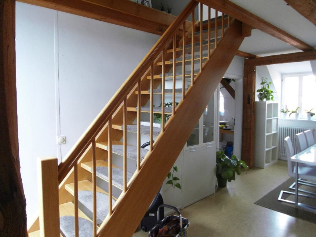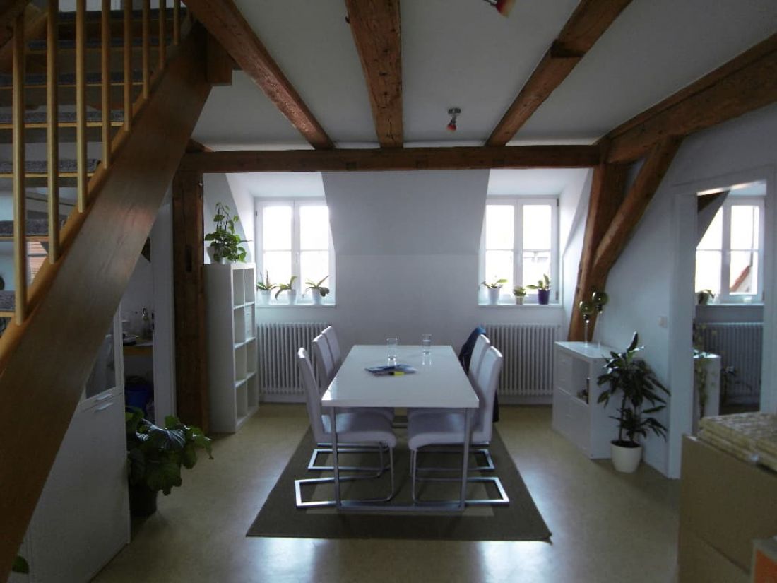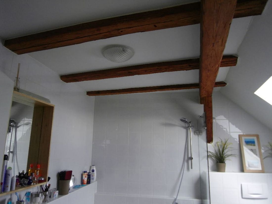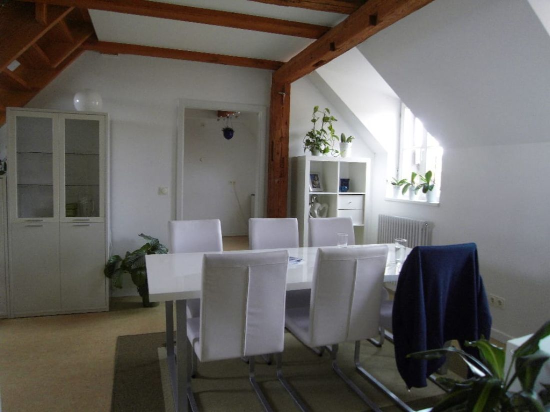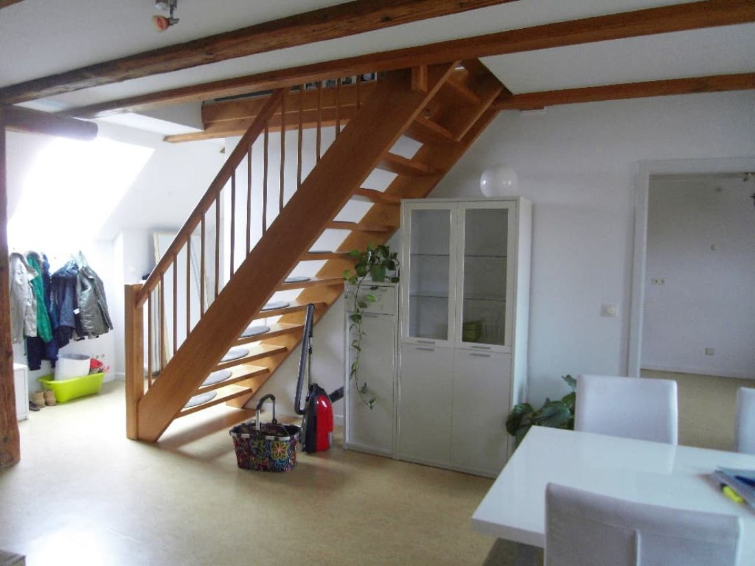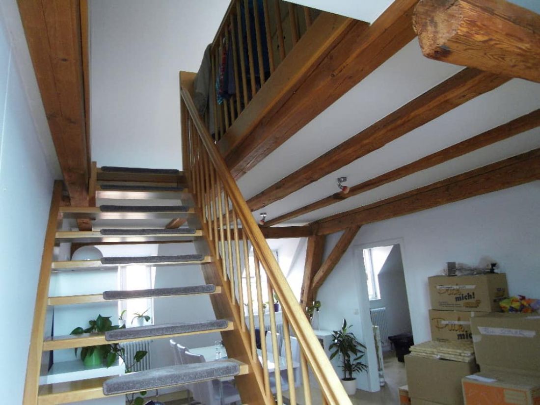 Dank der Geschosslage und der zahlreichen Fenster ist die Wohnung tageslichtverwöhnt. Besonderen Charme erzeugt das Objekt durch die perfekt hervorgehobenen Sichtbalken im Wohn-, Schlaf- und Badezimmer.