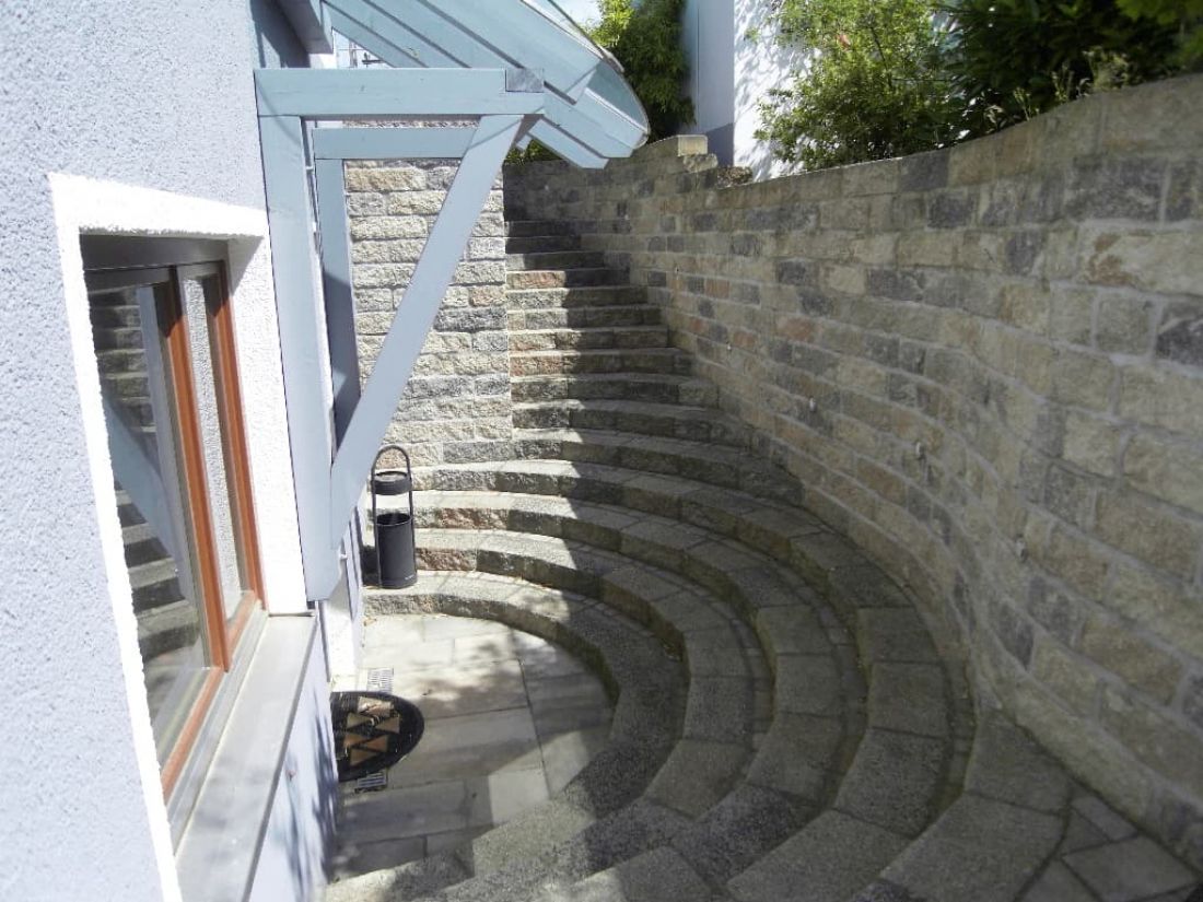 • Einfriedung in Edelstahl; leicht terrassierter Garten