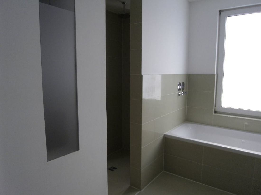 •Badezimmer (Tageslichtbad) mit bodentiefer, gefliester Dusche und Wanne; Waschmaschinenanschluss + Handtuchtrocknerheizkörper