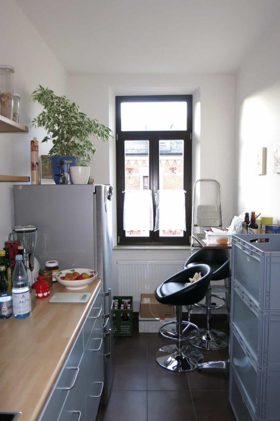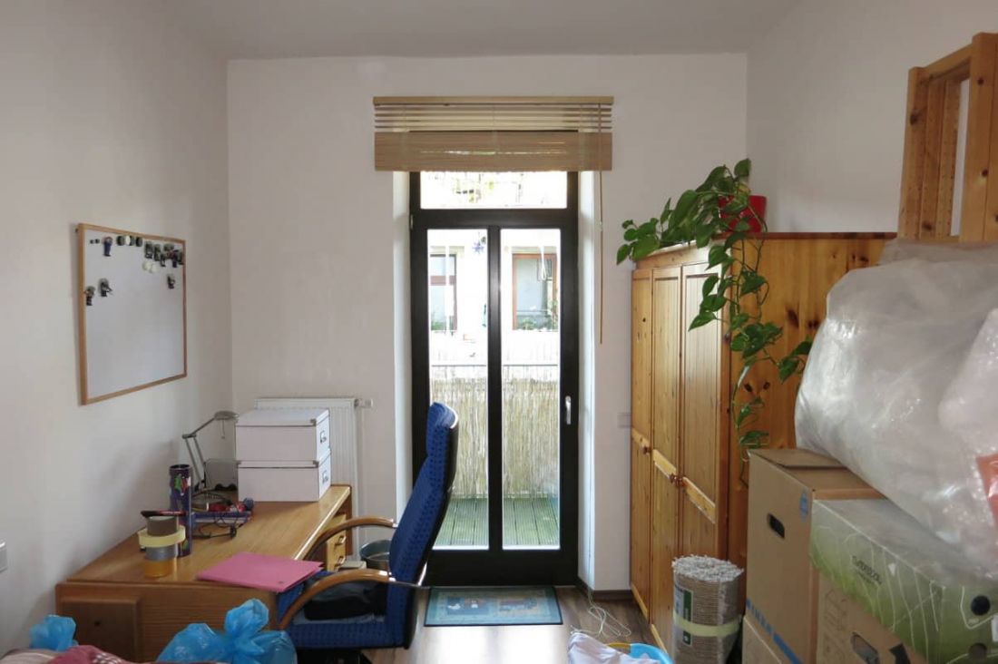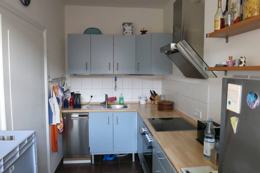 Die kleine, vorhandene Küchenzeile in weiß (nicht die in blau gehaltene Küche!) kann bei Bedarf von der Vormieterin abgelöst werden.