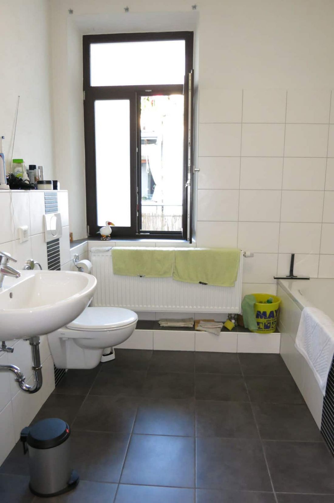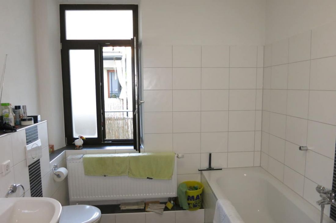- Bad gefliest mit Fenster und Badewanne