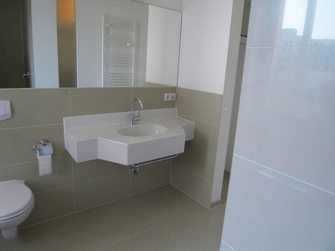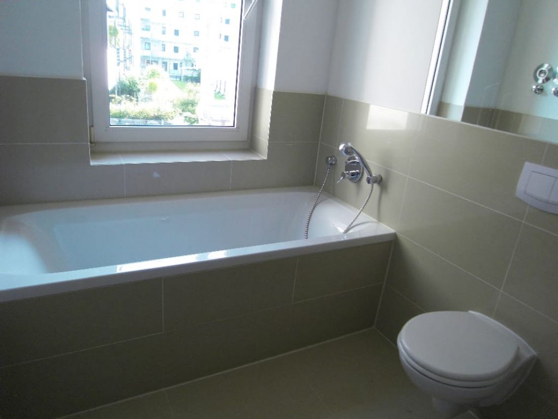• Badezimmer (Tageslichtbad) mit bodentiefer, gefliester Dusche und Wanne; Waschmaschinenanschluss + Handtuchtrocknerheizkörper