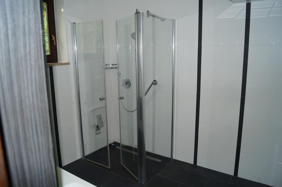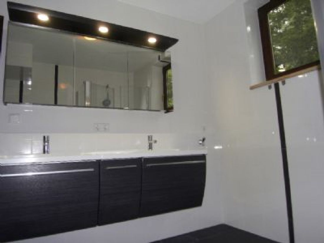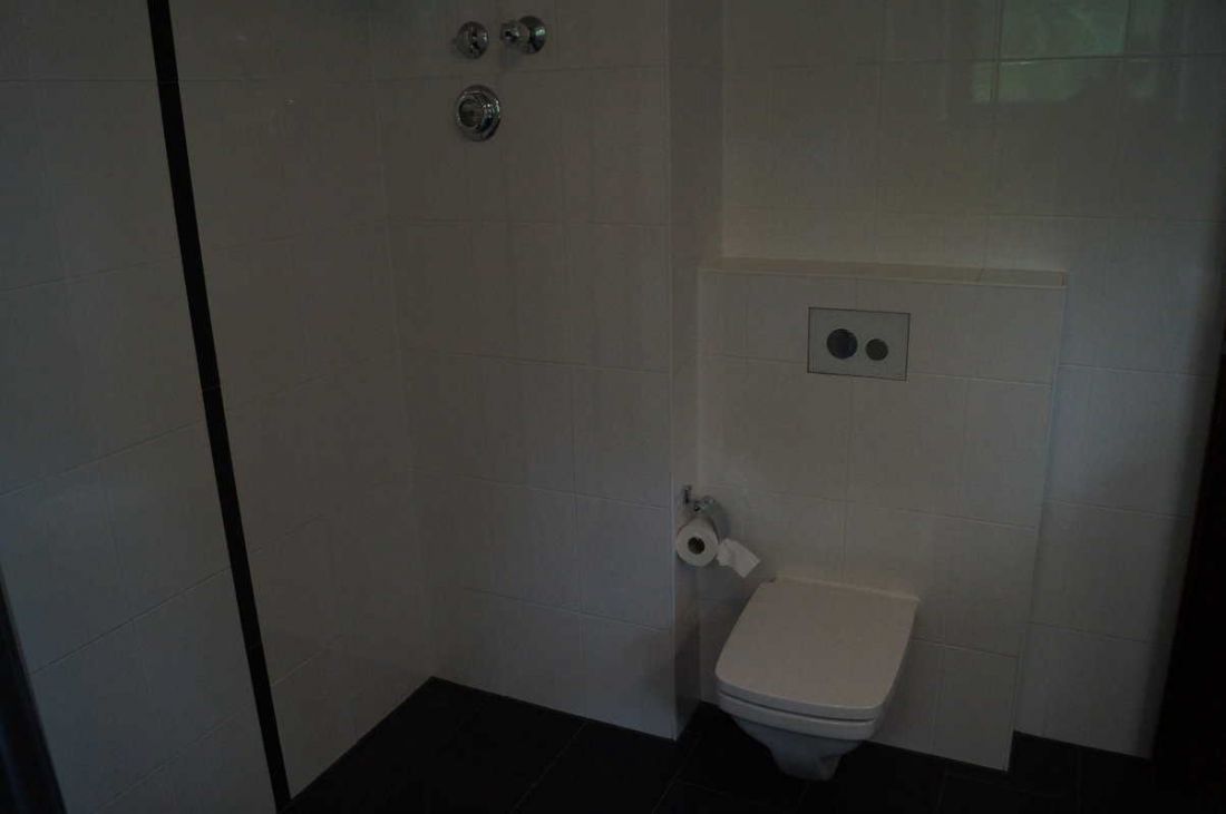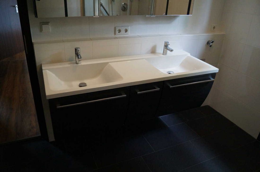 Das Duschbad mit Fenster ist deckenhoch weiß gefliest; der Steinfußboden ist dunkelgrau. Es verfügt über ein Doppelwaschbecken mit großzügigen Abstellflächen und beleuchtetem Spiegelschrank. Ein Waschmaschinenanschluss ist vorhanden.