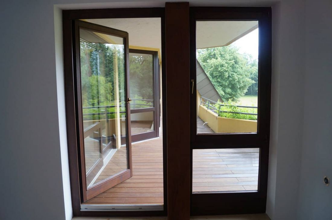 Die Türen und doppelverglasten Holzfenster sind dunkelbraun.