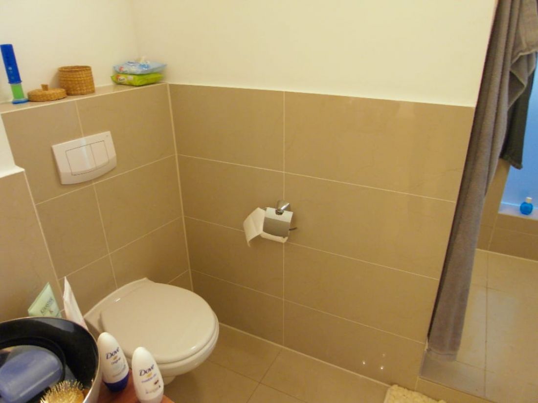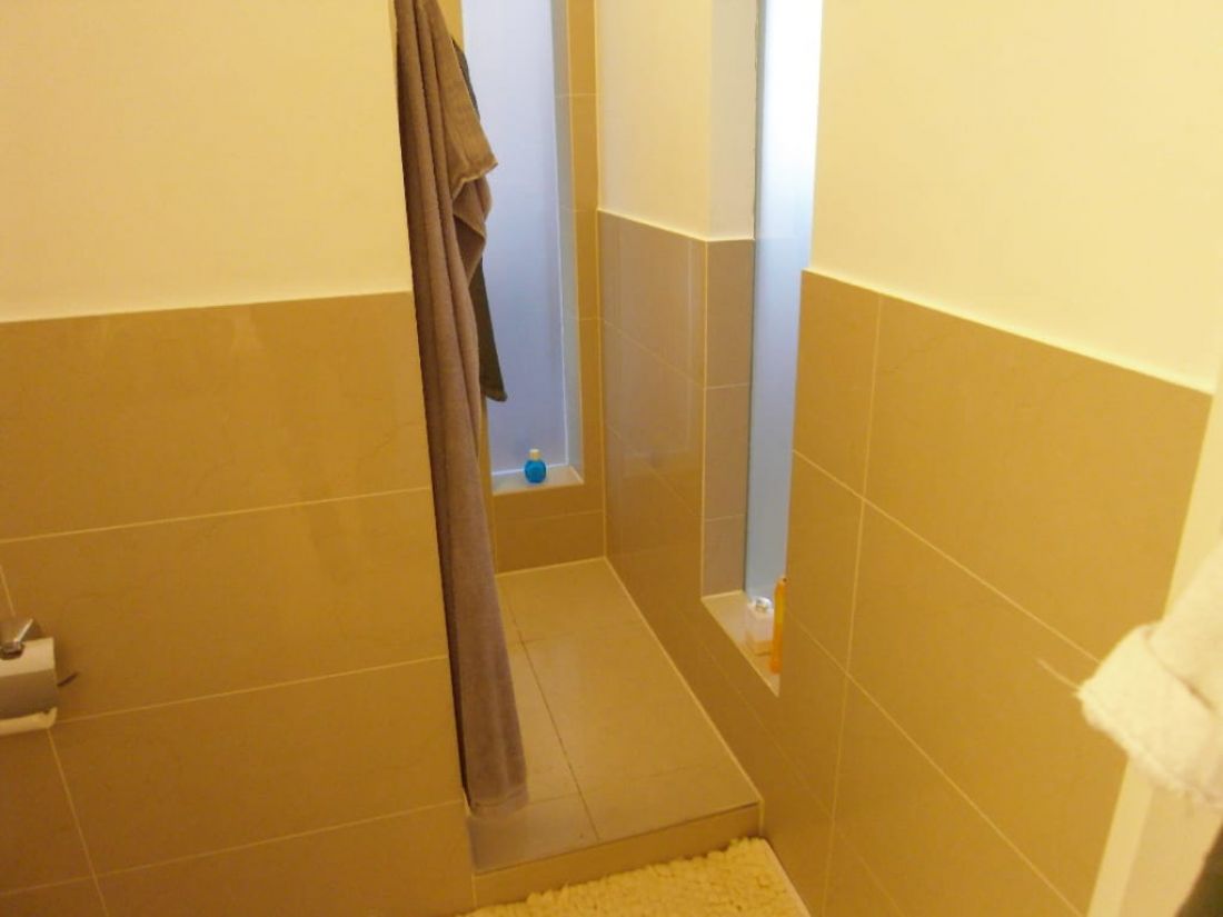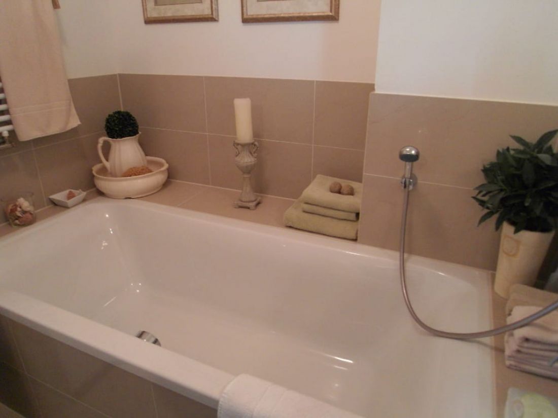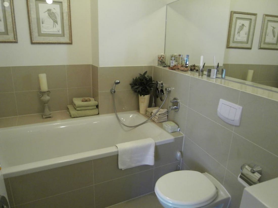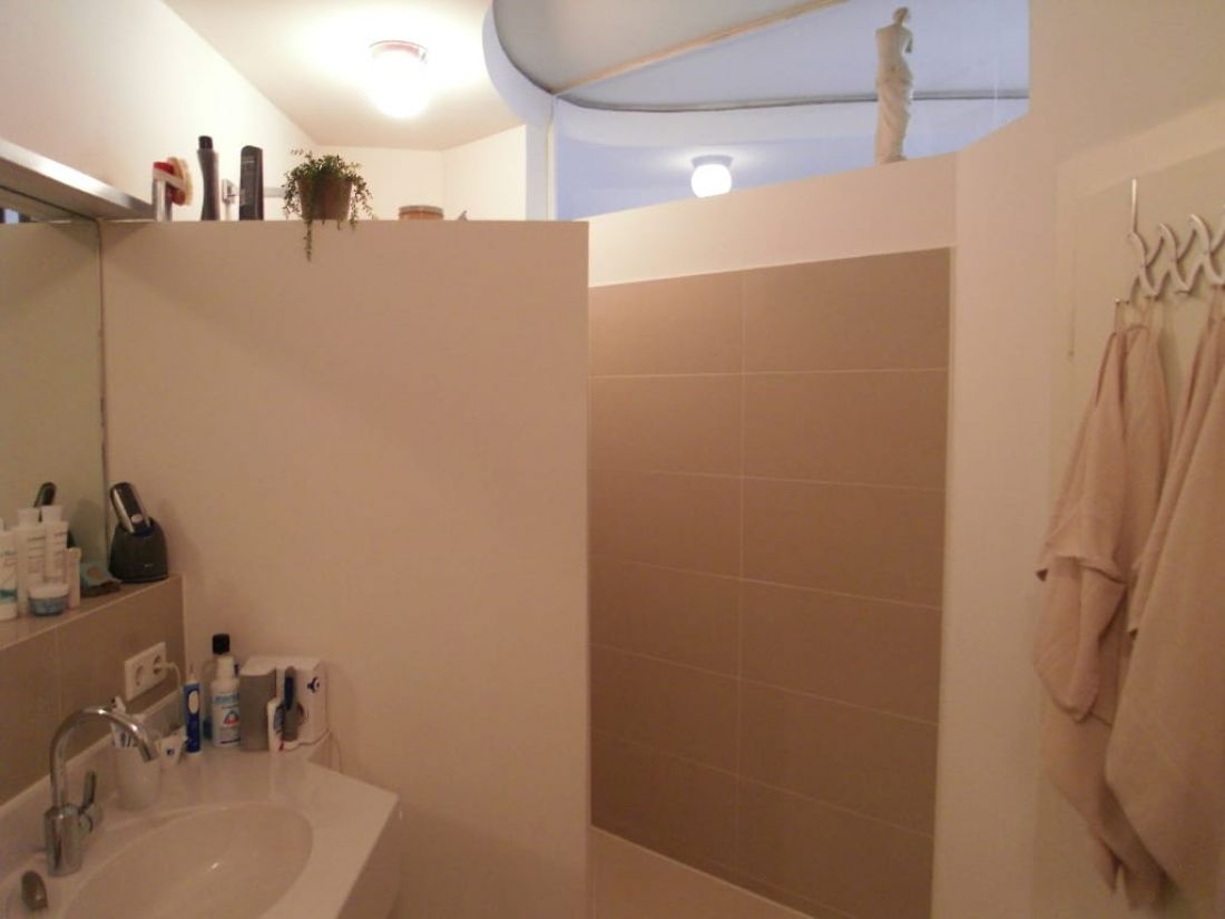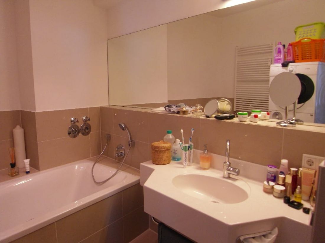 • Badezimmer mit Dusche und Wanne; Waschmaschinenanschluss + Handtuchtrocknerheizkörper