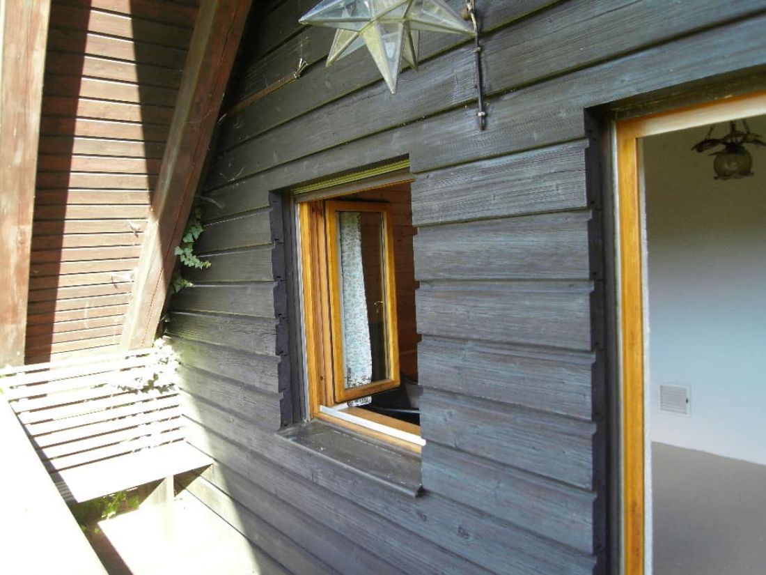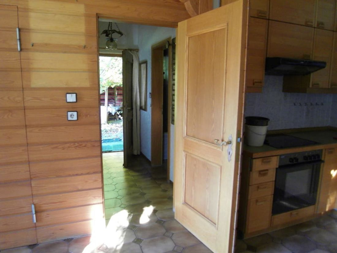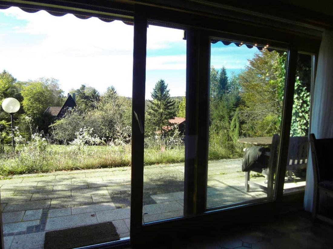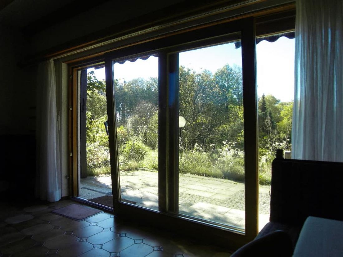 - abschließbare Holzfenster mit Isolierverglasung und Außenrollos (Kunststoff); Panorama-Schiebetür im Wohn-/Esszimmer