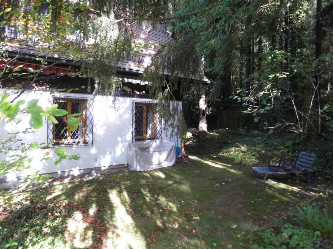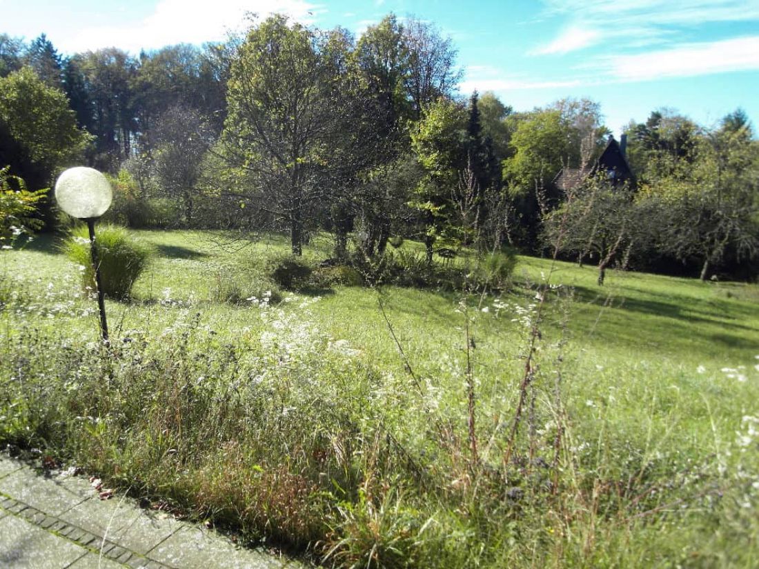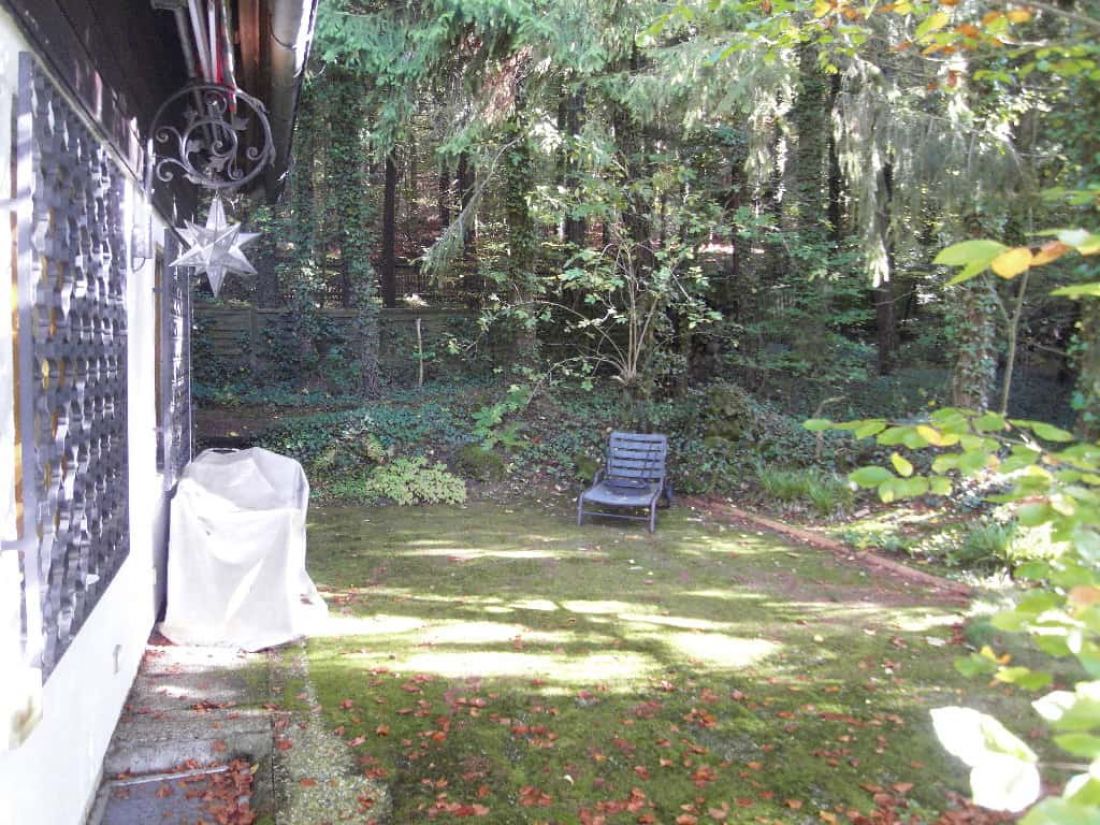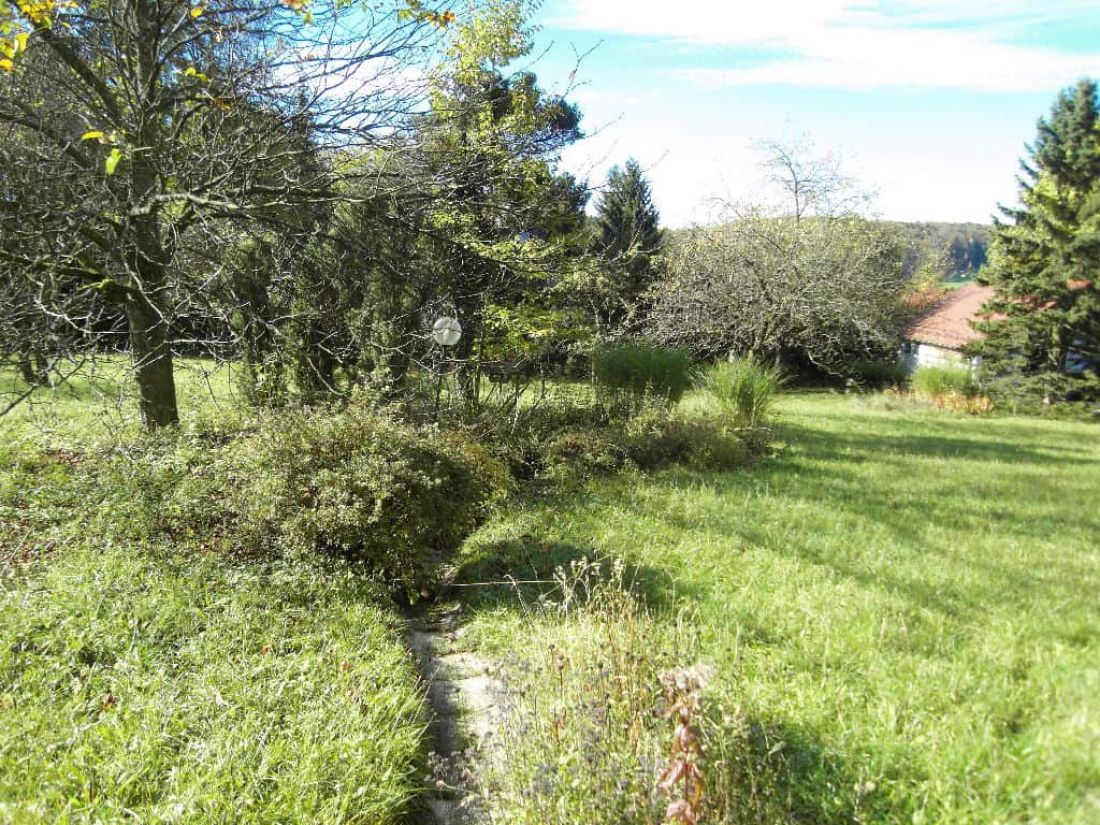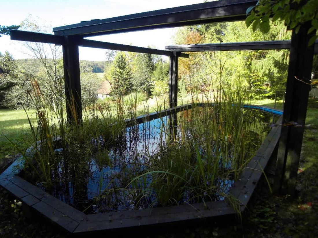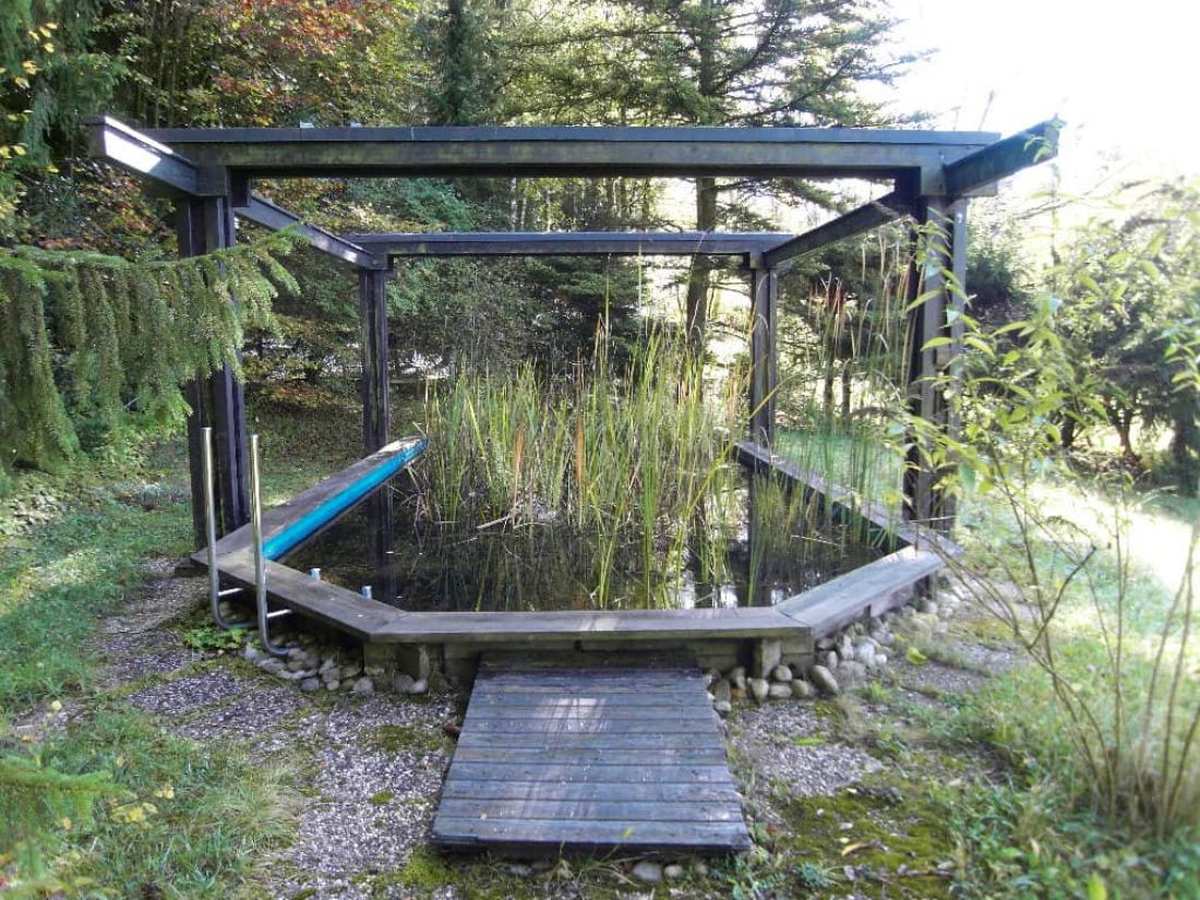 In dem liebevoll angelegten Garten befinden sich ein Bioteich (ehem. Swimmingpool), ein alter Baumbestand, ein Bächlein sowie zahlreiche Orte zum verweilen – so z. B. ein Pavillon.