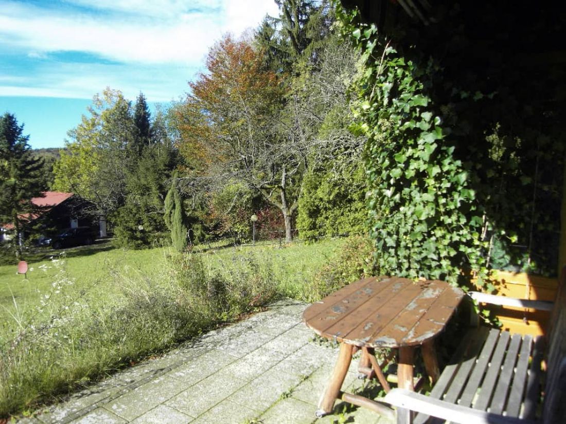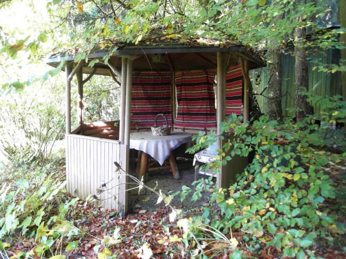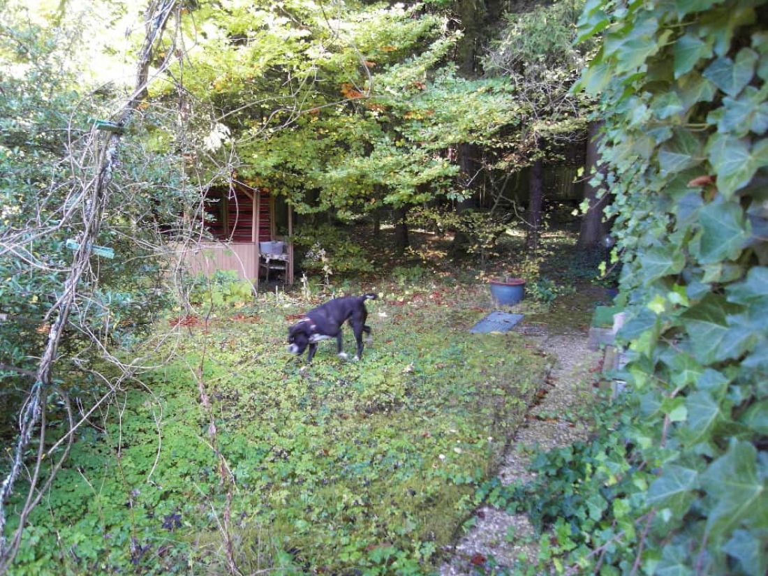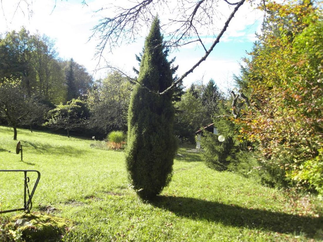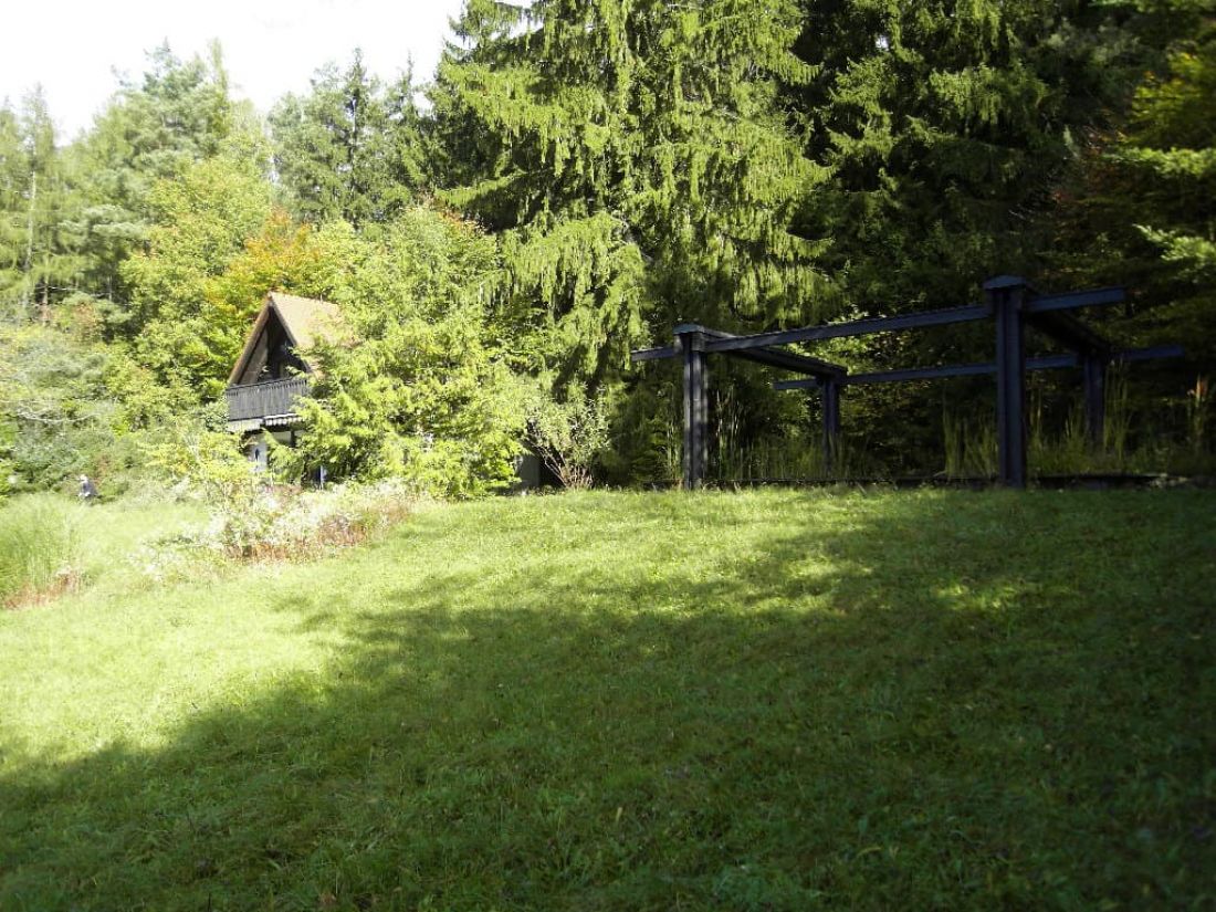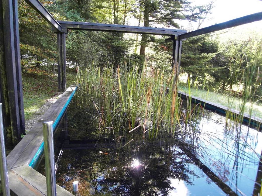 In dem liebevoll angelegten Garten befinden sich ein Bioteich (ehem. Swimmingpool), ein alter Baumbestand, ein Bächlein sowie zahlreiche Orte zum verweilen – so z. B. ein Pavillon.