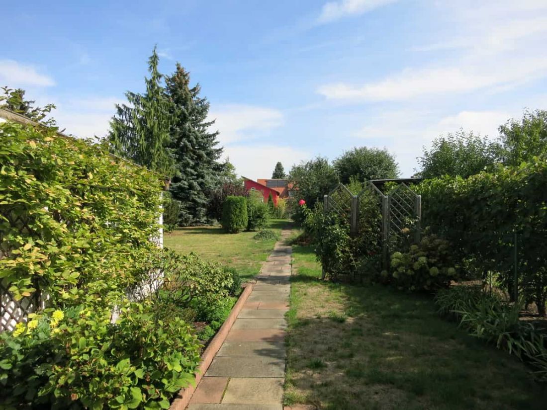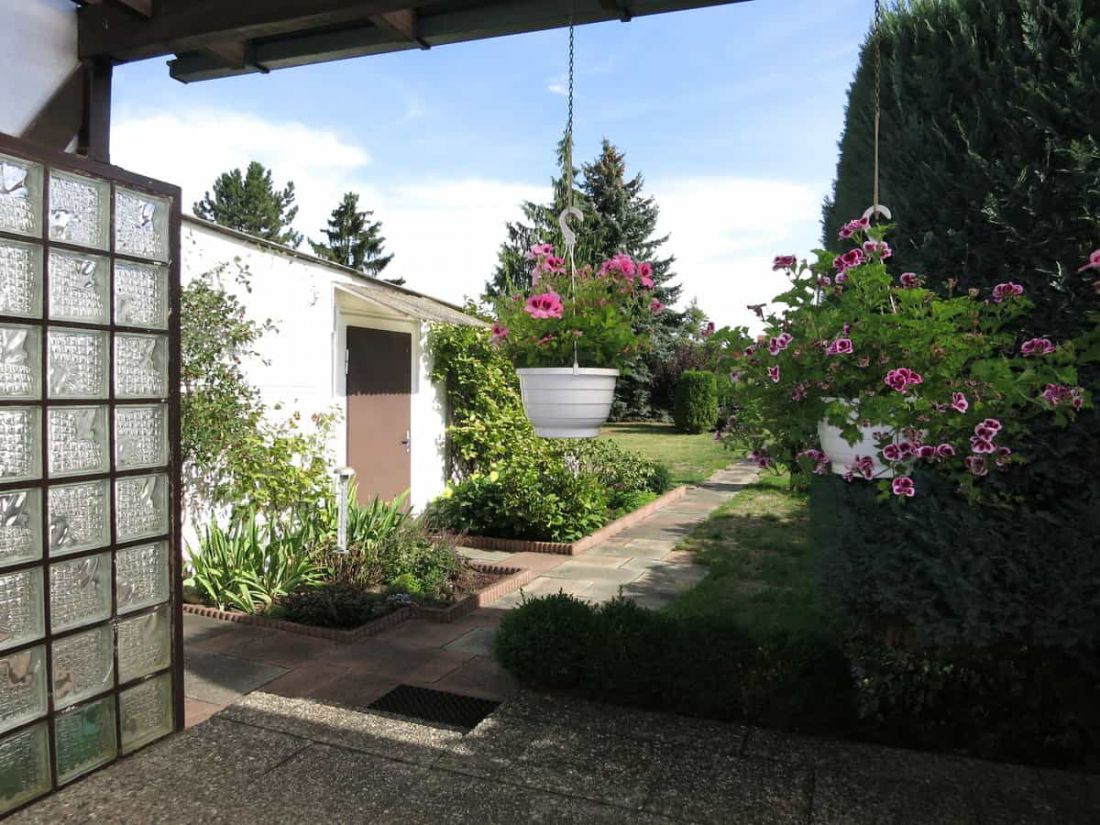 Eine überdachte Terrasse, ein Geräteschuppen und eine große Garage sind ebenso auf dem Grundstück vorhanden wie ein eigener, kleiner Baumbestand.