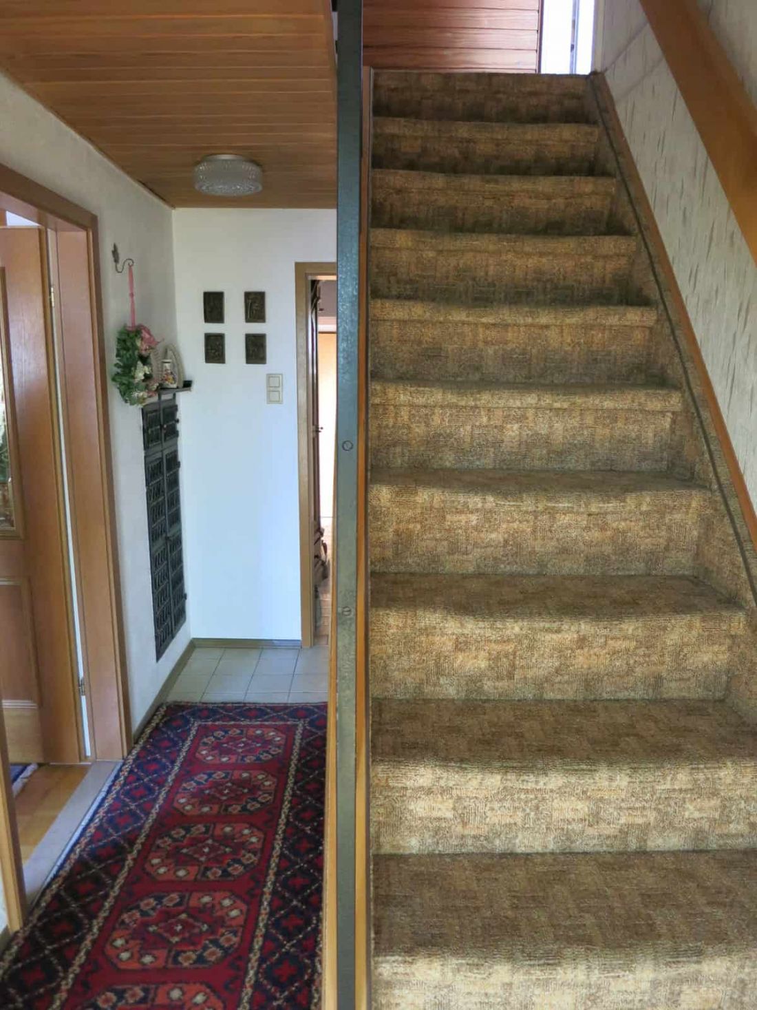 Das Objekt verfügt über Stäbchenparkett im Wohnzimmer, Fliesen im Erdgeschoss und Teppichboden im Obergeschoss.