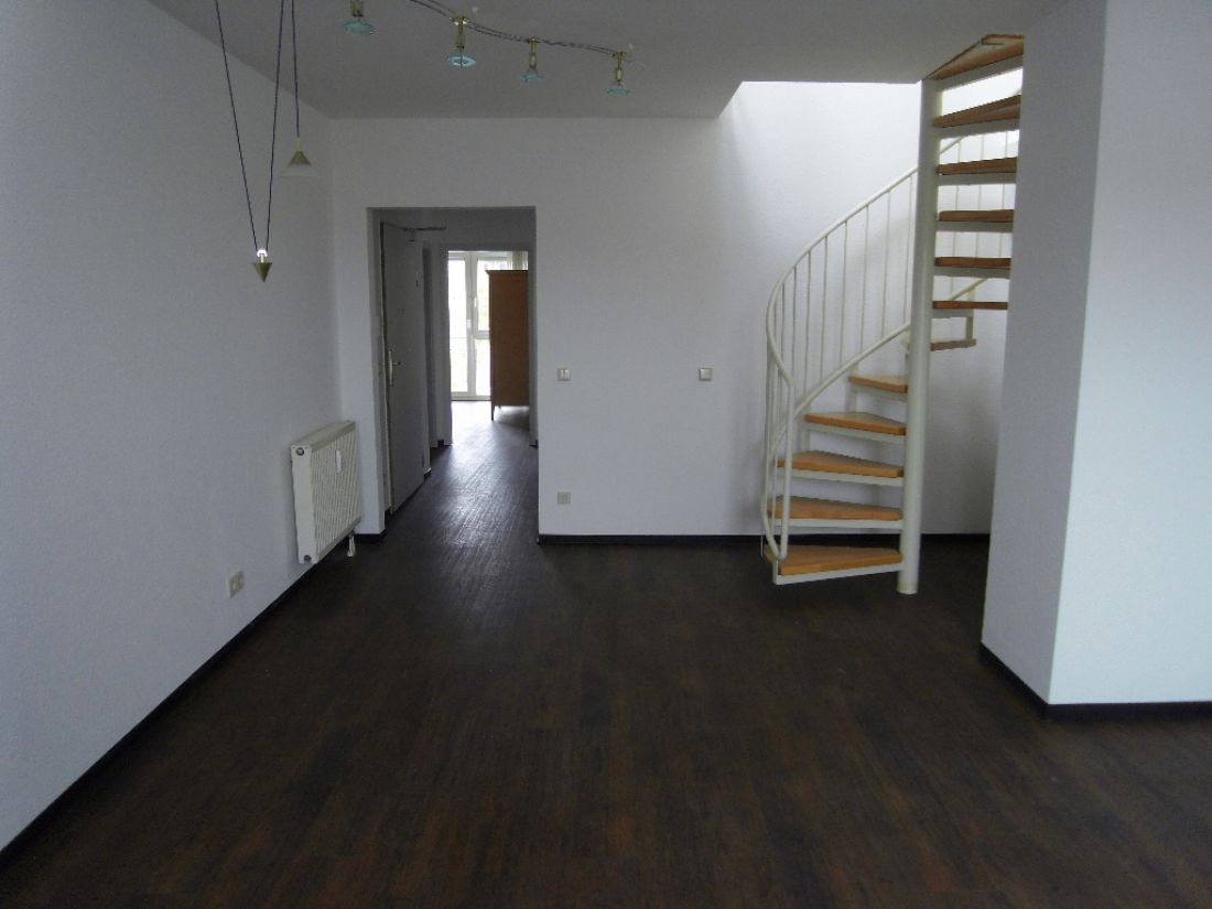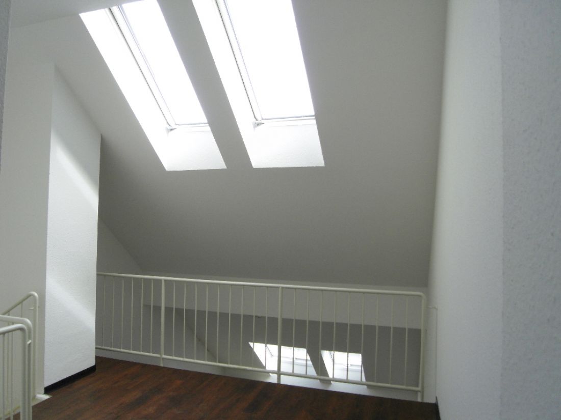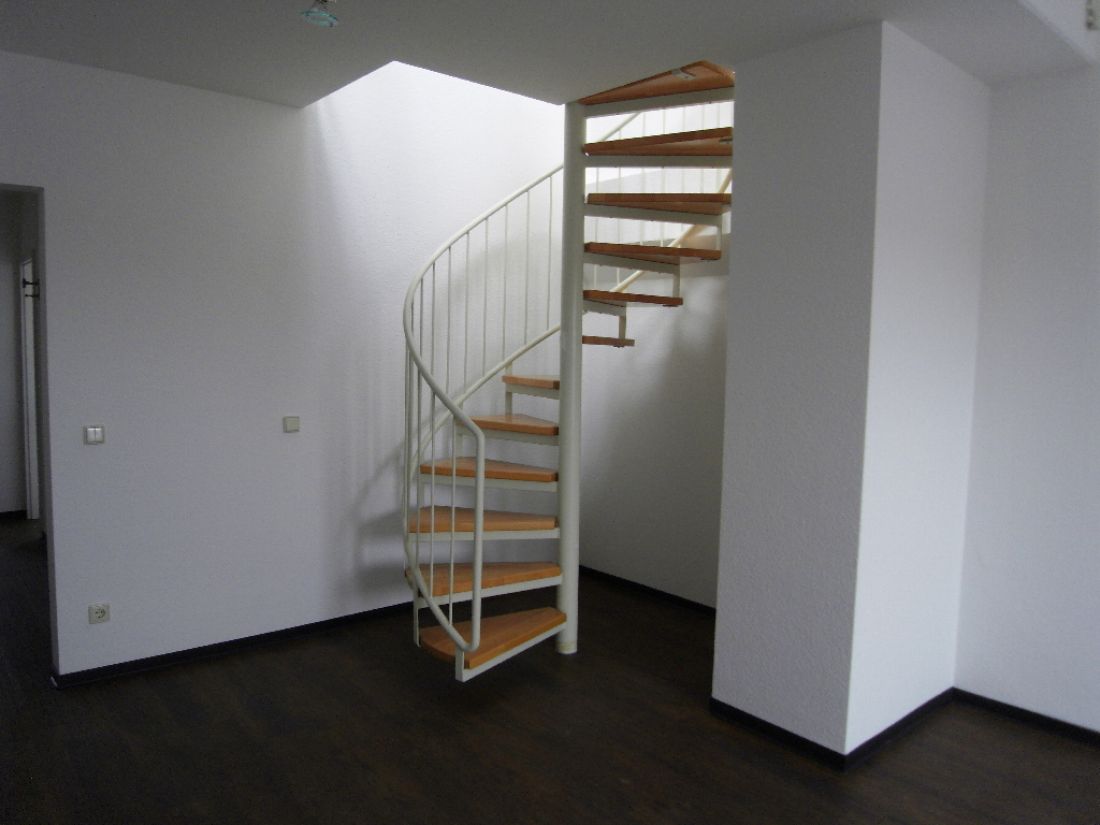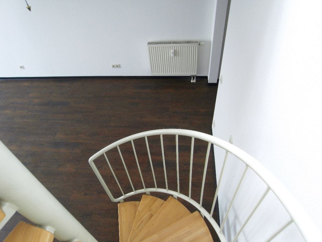 Die Wohnung ist aufgeteilt in zwei Etagen. In der 1. Etage befinden sich eine Diele, Abstellraum, innenliegende Küche (mit elektr. Abzug und Festglaselement für Tageslicht), Bad mit Wanne + WC (inkl. Fenster u. Waschmaschinenanschluss), abgeschlossenes Schlafzimmer mit direktem Zugang zum Balkon (Nord-West-Ausrichtung), Wohnzimmer mit offener Treppe in die 2. Etage, die eine Empore und eine zusätzliche Abstellkammer aufweist.