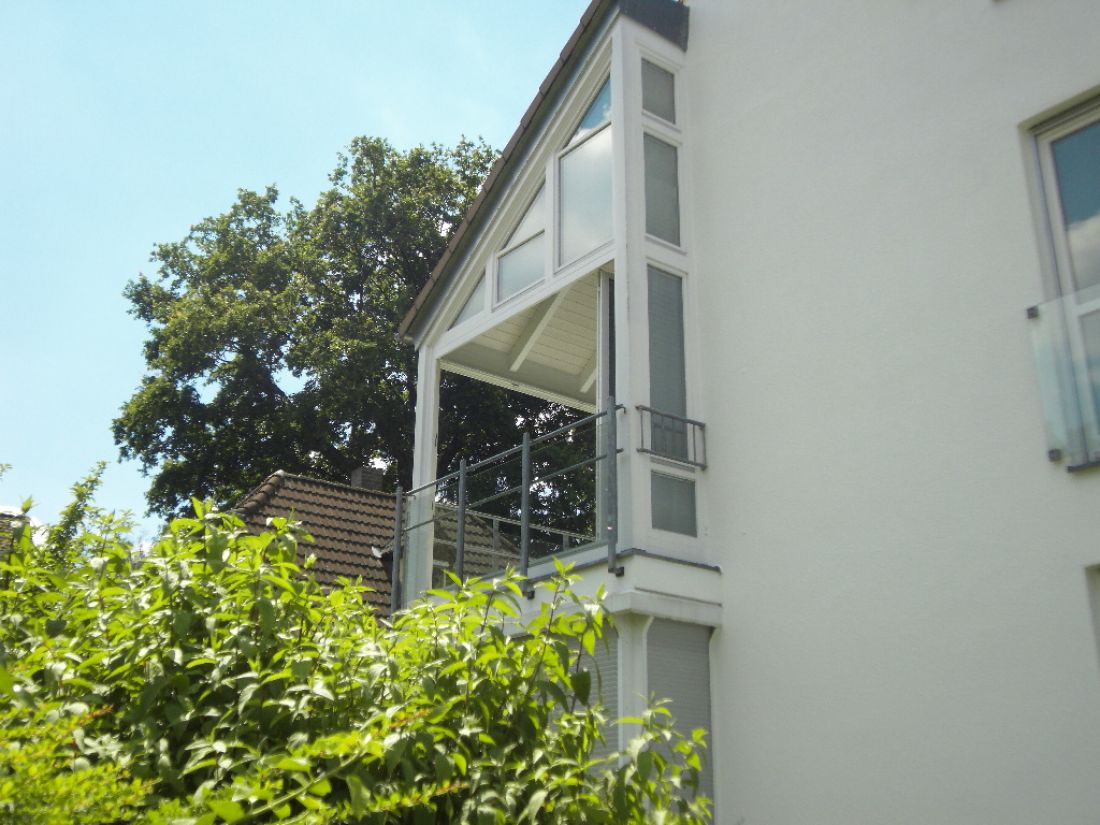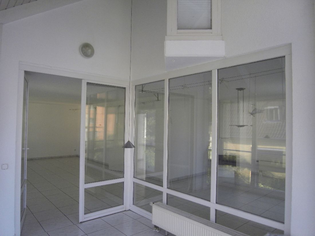 Die Wohnung ist aufgeteilt in eine große Diele, Küche, Bad mit Dusche sowie WC, ein großzügiges Wohnzimmer mit Zugang zum Wintergarten und ein über eine Treppe mit Galerie erschlossenes Dachgeschoß. Im DG befinden sich ein Tageslichtbad mit Eckbadewanne, zwei Waschbecken und WC, zwei Schlafräume (einer mit begehbarem Kleiderschrank bzw. angrenzendem Abstellraum ) sowie ein Arbeitszimmer. Sämtliche Räume sind durch den Flur erschlossen (keine Durchgangszimmer). Insgesamt verfügt diese Immobilie über sehr gute Tageslichtverhältnisse. Auf dem Grundstück befindet sich zudem ein Gartenanteil, welcher der betreffenden Wohnung laut Teilungserklärung zugeordnet ist.