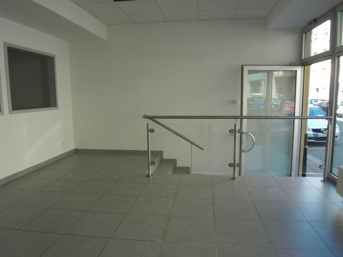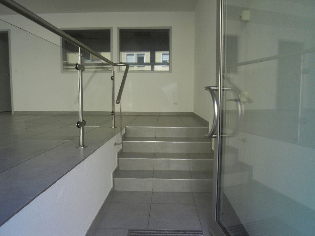 - Laden mit Treppenaufgang ins Hochparterre; Glas-Edelstahl-Absturzsicherung (Handlauf)