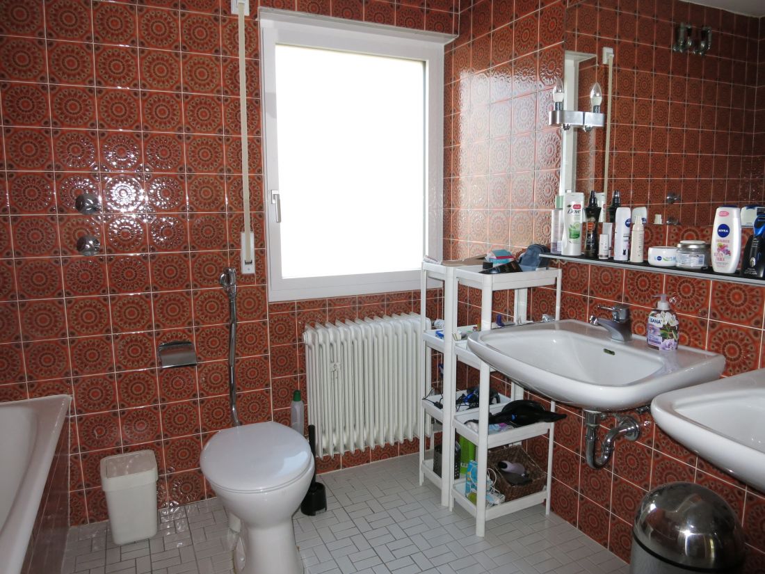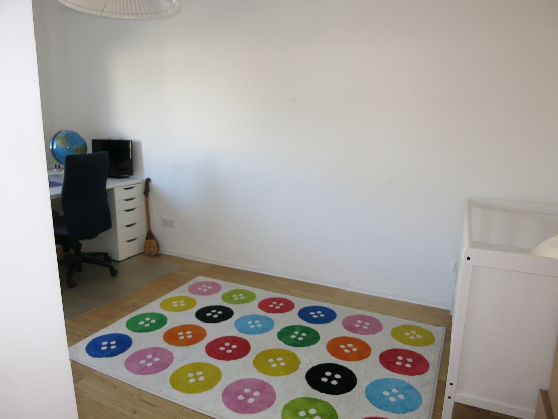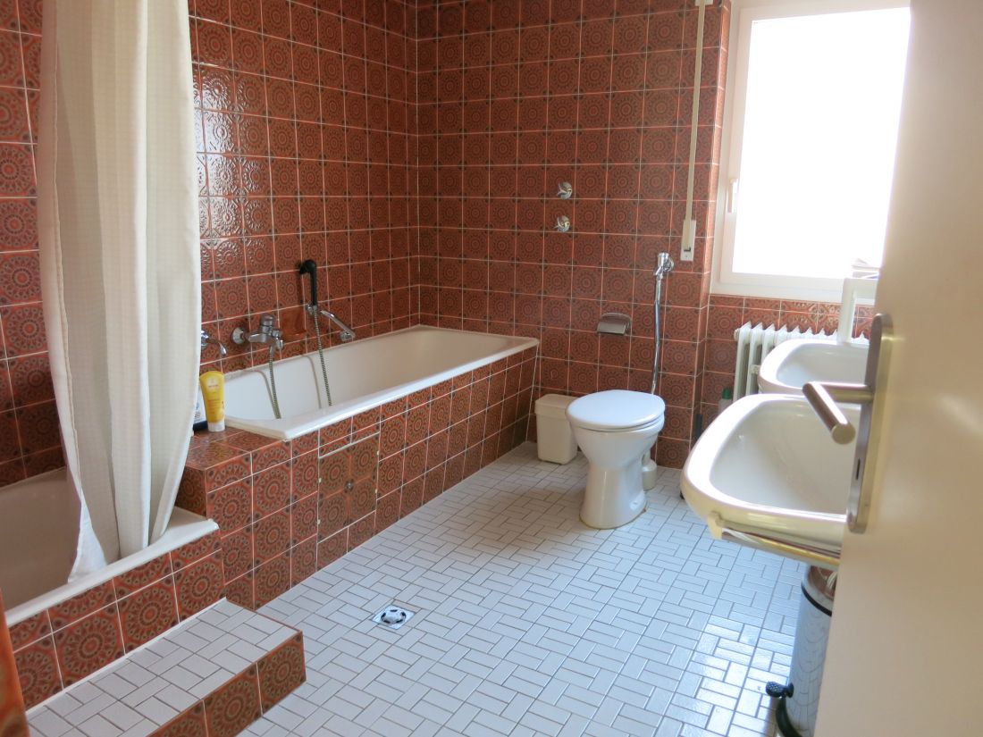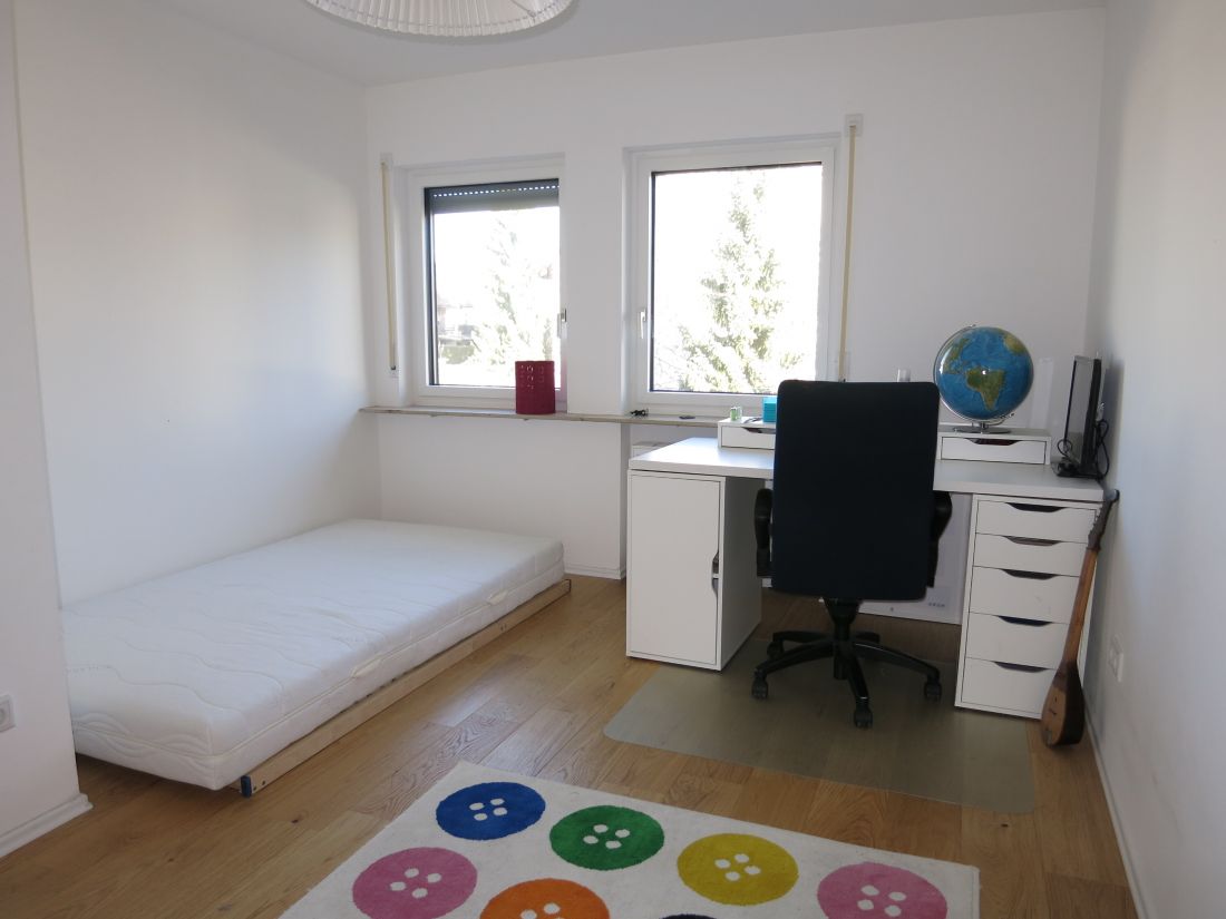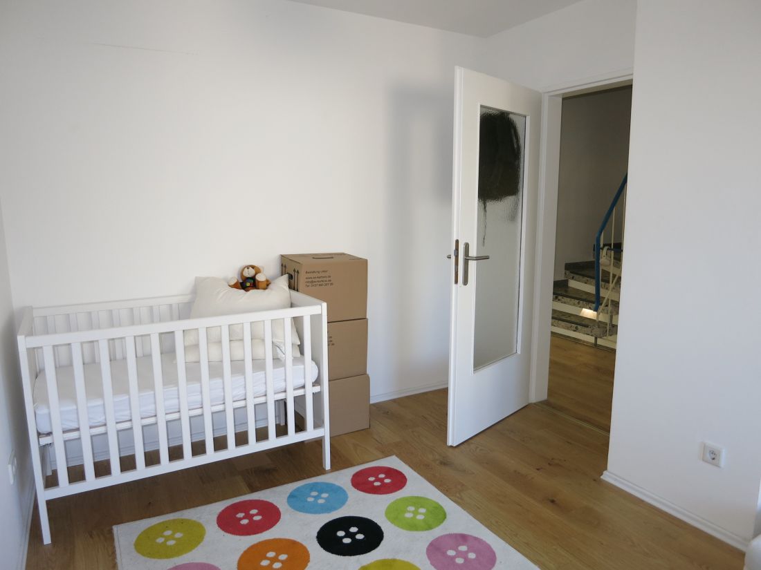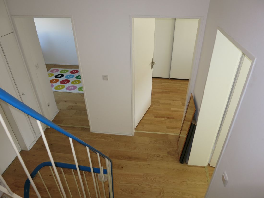 Das Obergeschoss verfügt über ein Badezimmer mit Badewanne, Dusche und zwei Waschbecken sowie drei weitere Zimmer (Schlaf-/Arbeits-/Kinderzimmer), eines davon mit Zugang zum Balkon in Süd-West-Ausrichtung.