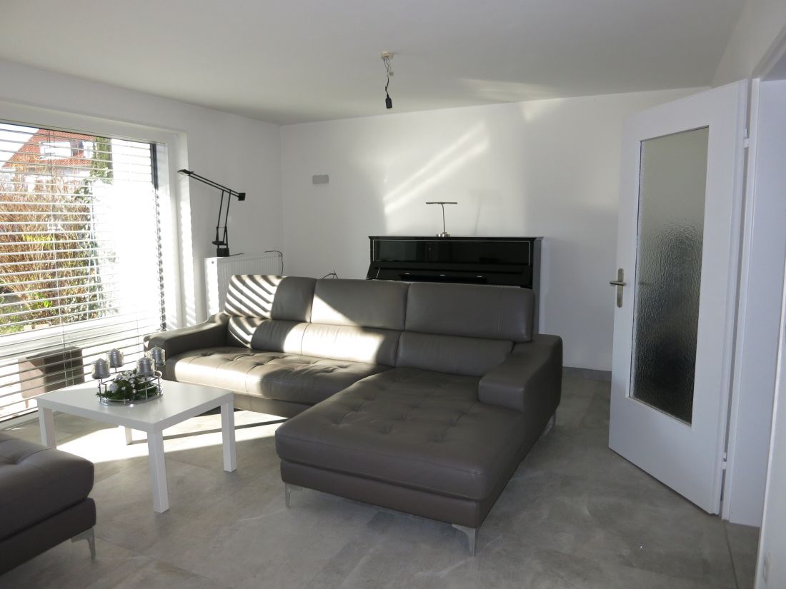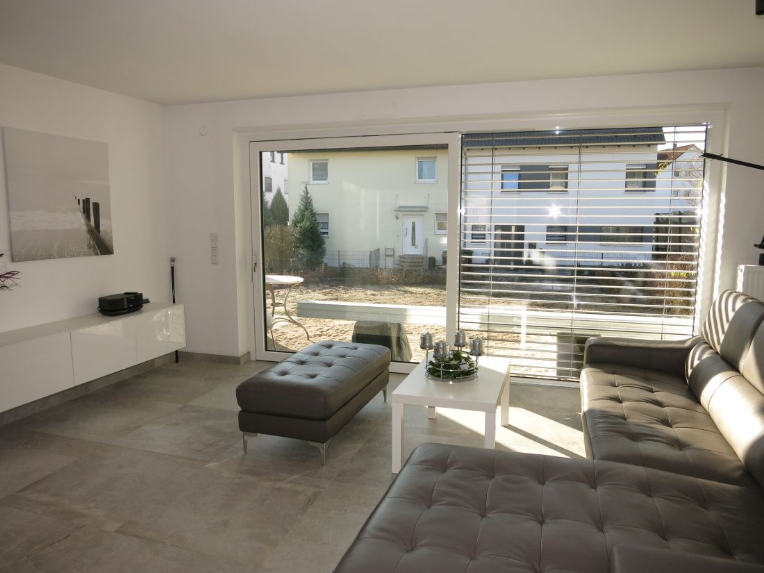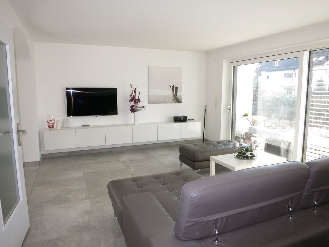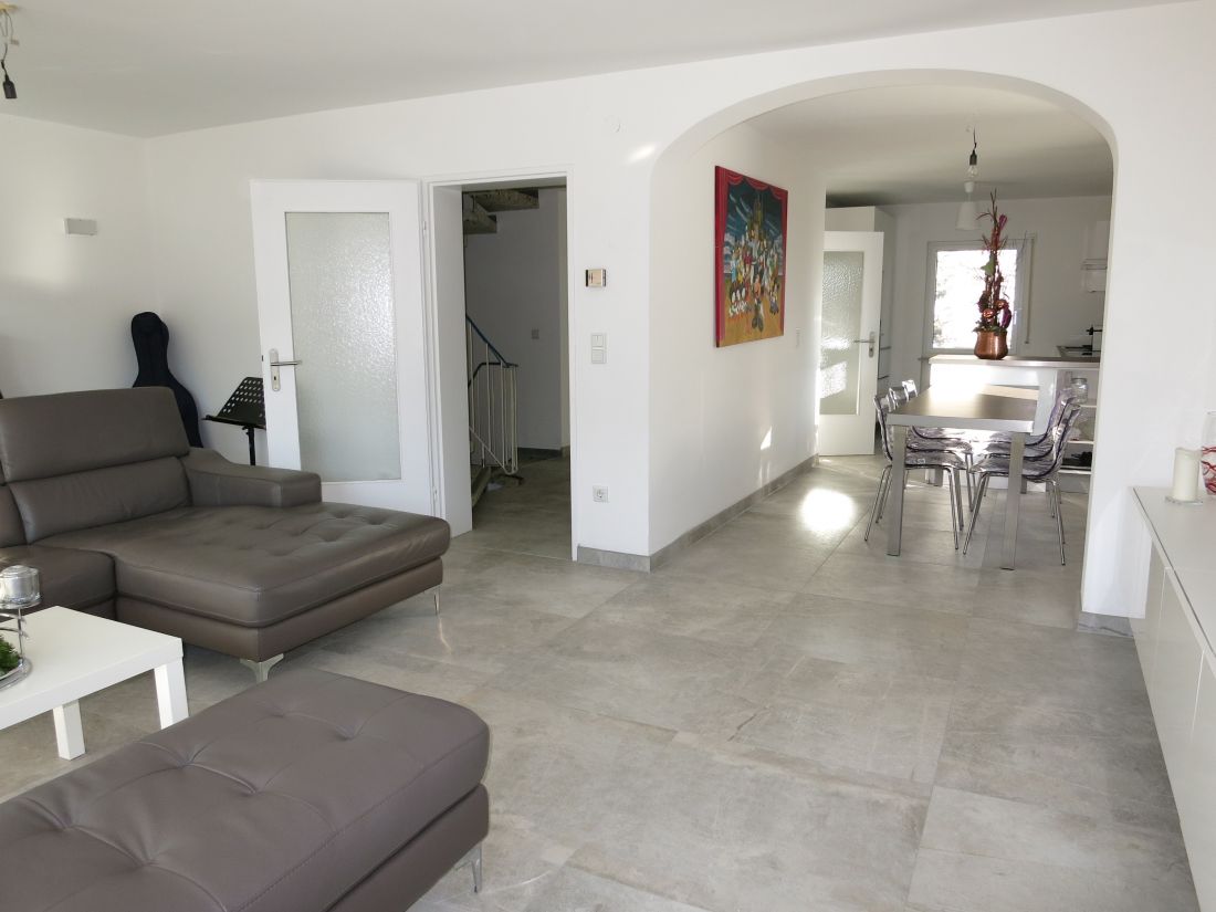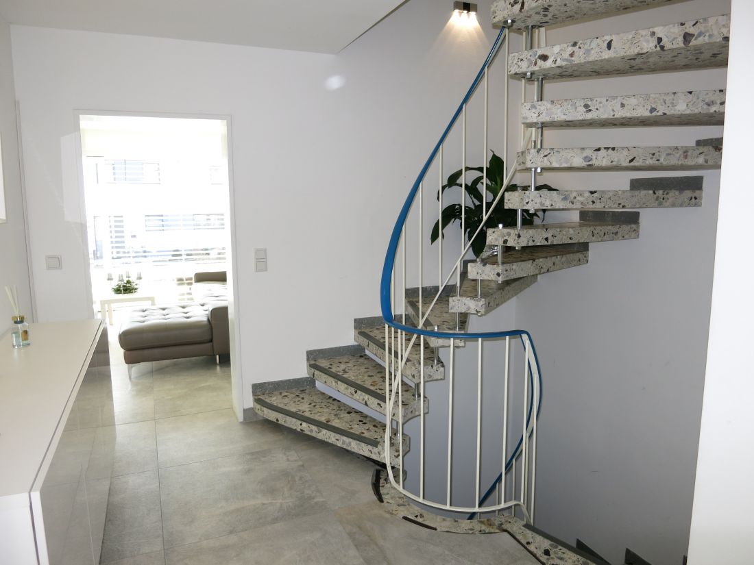Im Erdgeschoss wurden hochwertige Feinsteinfliesen in Betonoptik verlegt, im Obergeschoss Parkettboden.