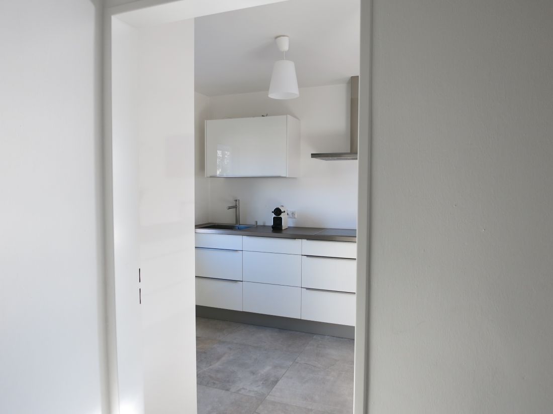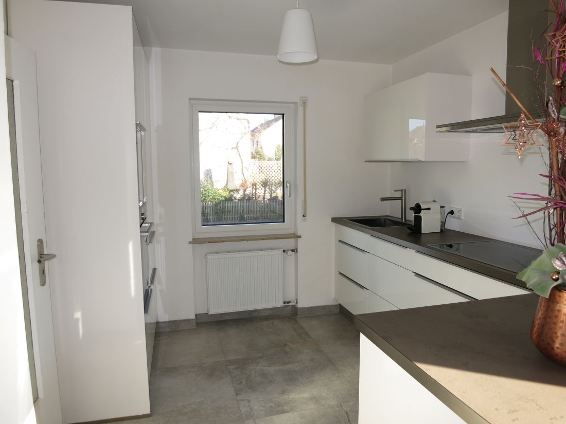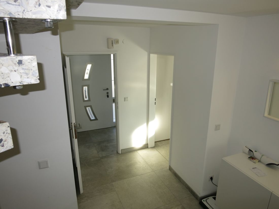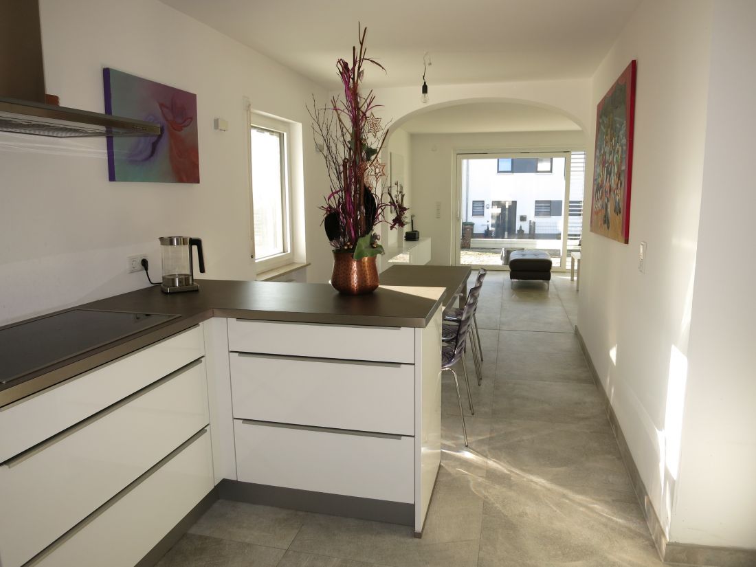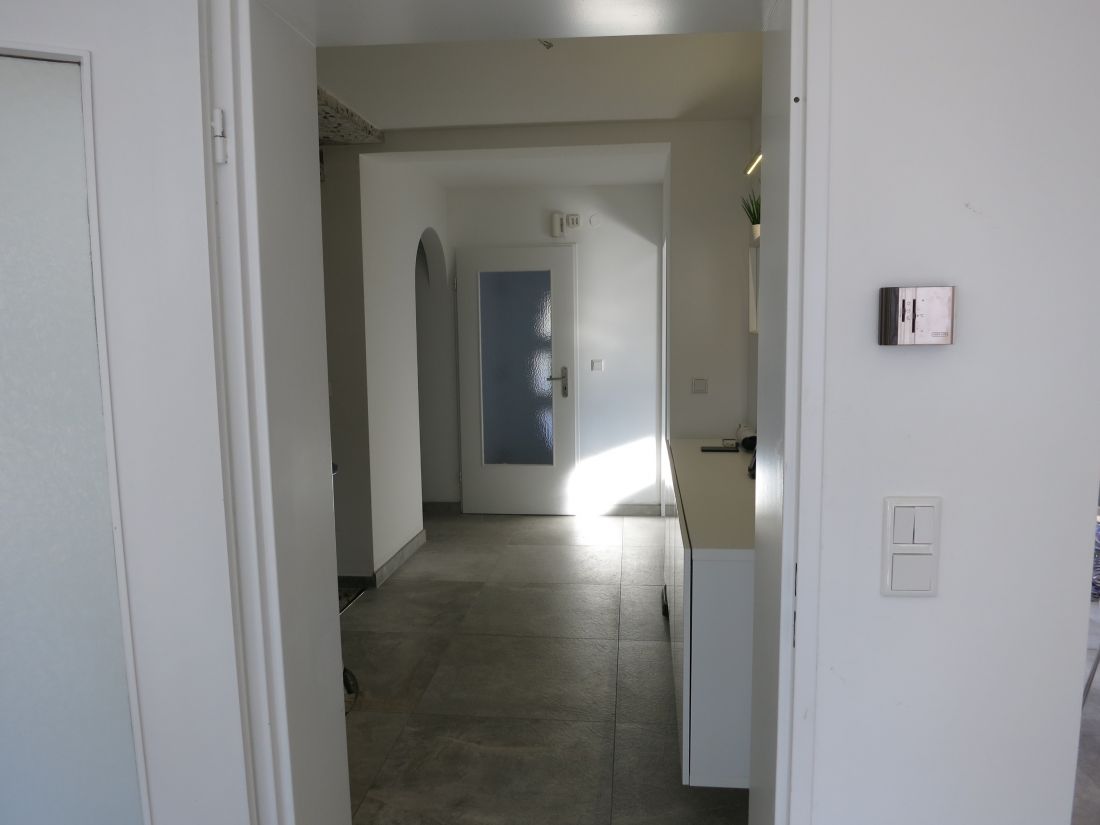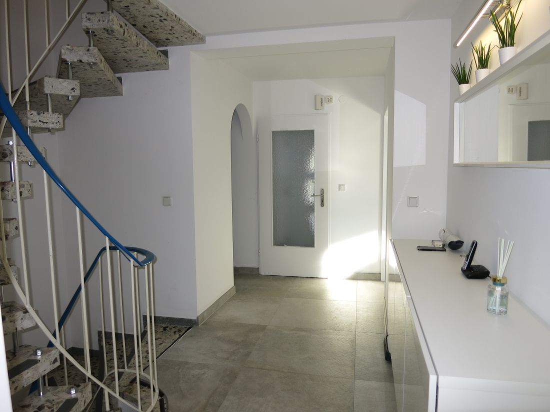 Im Erdgeschoss wurden hochwertige Feinsteinfliesen in Betonoptik verlegt, im Obergeschoss Parkettboden.
