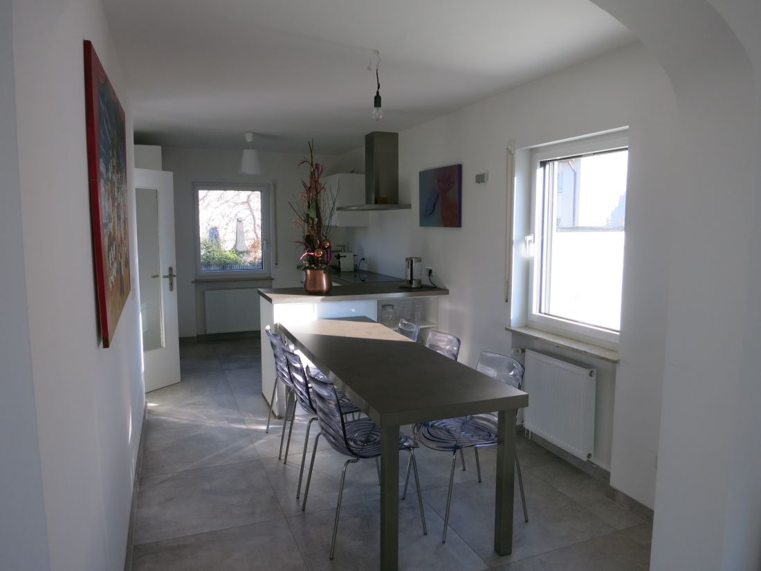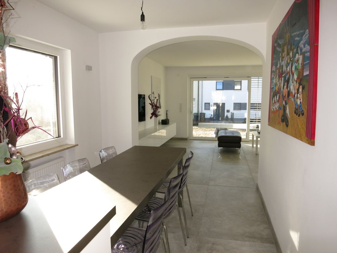 Das Erdgeschoss ist aufgeteilt in einen Eingangsbereich mit Garderobe, Gäste-WC und Flur, über den man sowohl in die Küche als auch ins Wohnzimmer gelangt. Hier wurde ein Durchbruch geschaffen (abweichend vom Grundriss), sodass ein großer, offener Wohn- und Essbereich mit idealen Tageslichtverhältnissen und dementsprechender Wohlfühlatmosphäre entstanden ist.