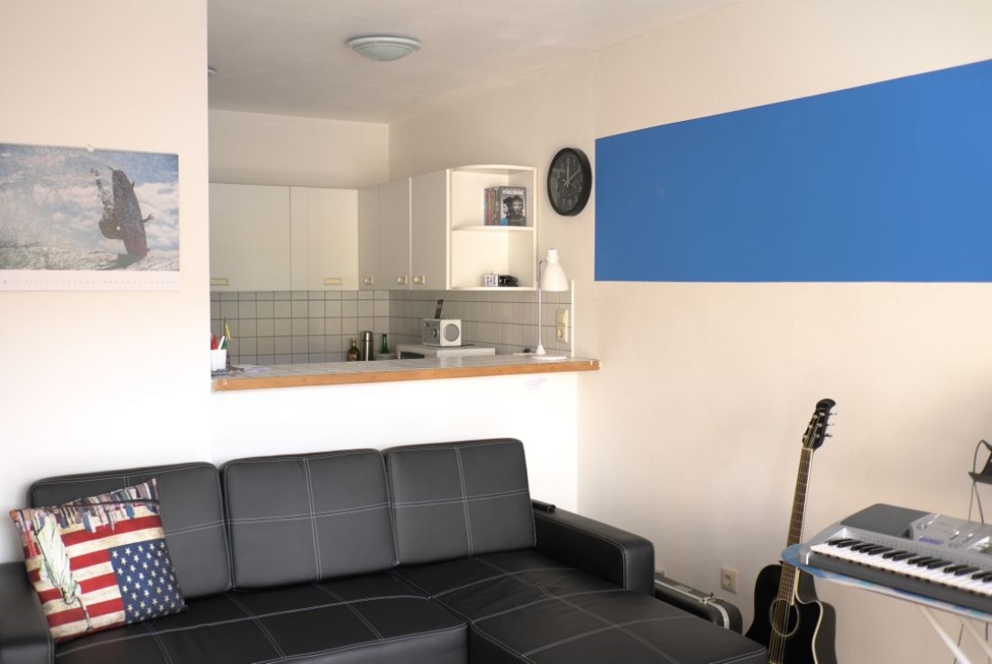 - Fußböden: Laminat in Wohnzimmer + Schlafbereich + Fliesen in Bad und Küche
