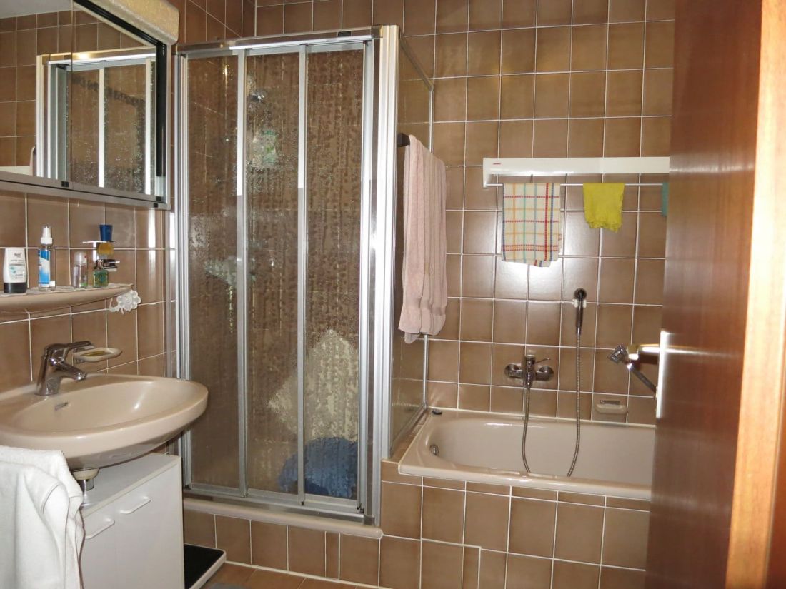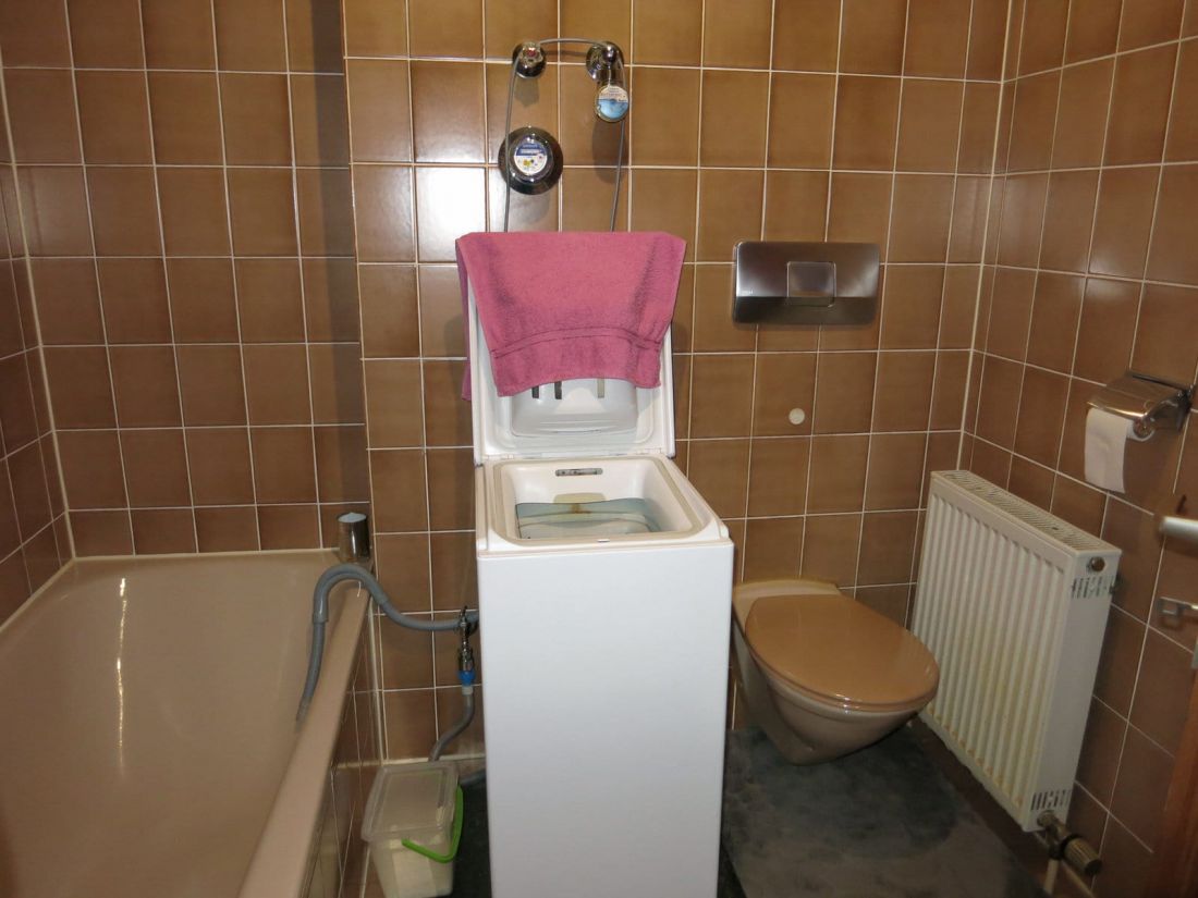 - Badezimmer mit Badewanne, Duschkabine und Waschmaschinenanschluss