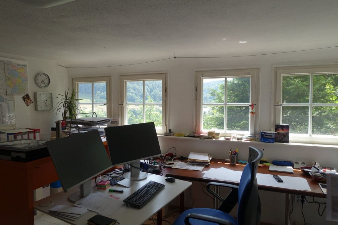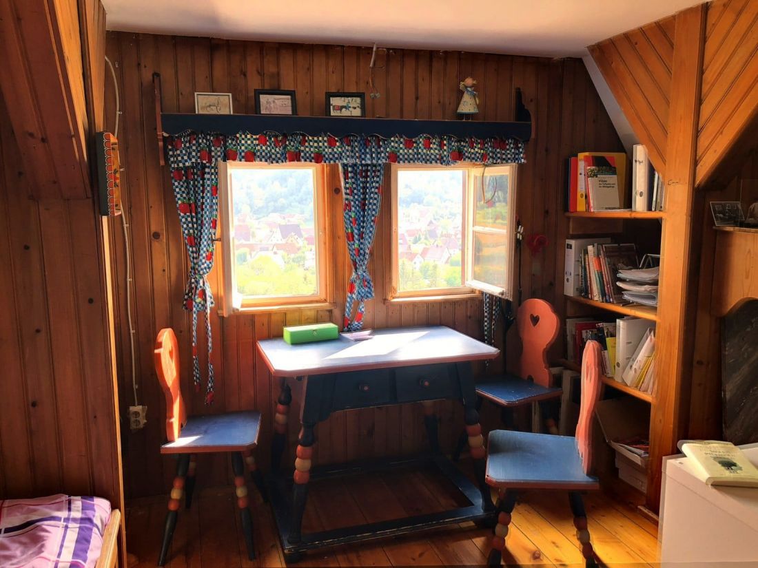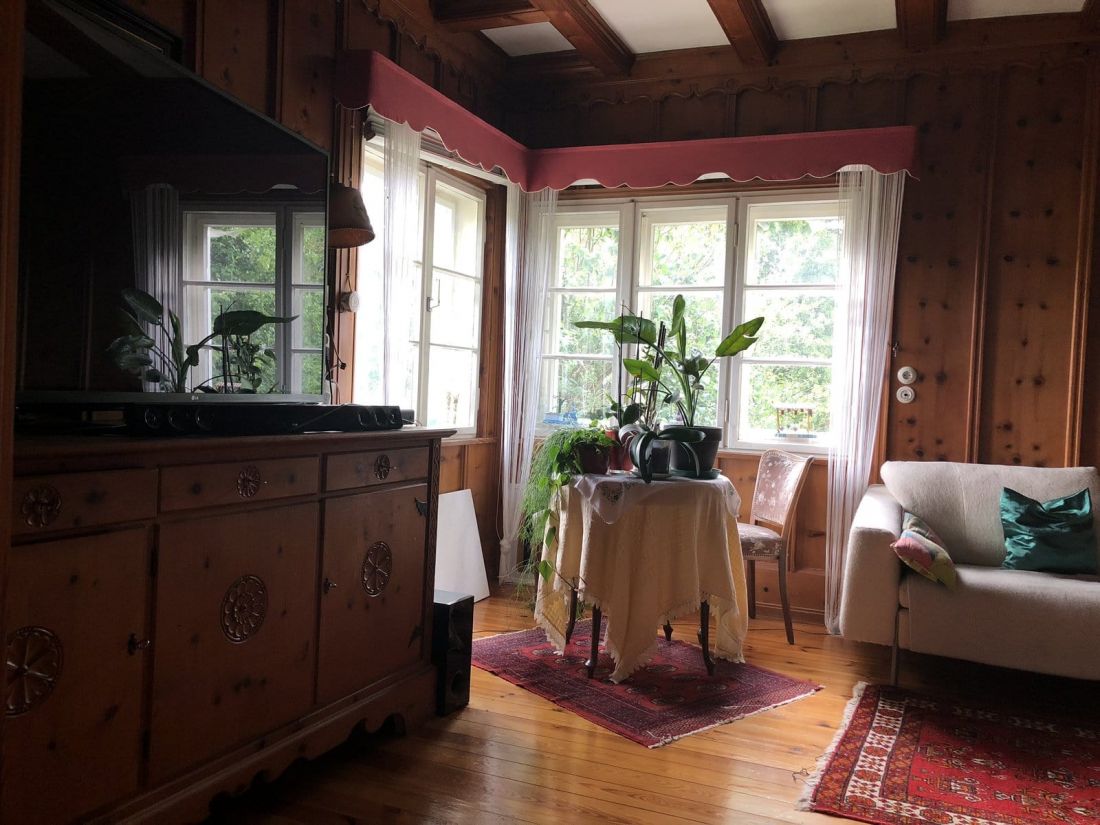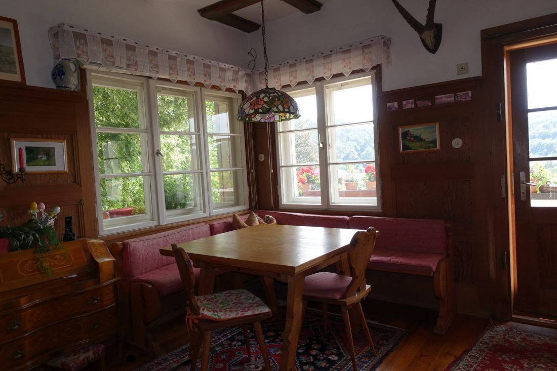 Diverse Holzvertäfelungen, Kassettentüren und Einbauschränke verleihen den Räumen ein behagliches Raumklima. Zahlreiche Modernisierungsmaßnahmen wie z. B. die Sanierung des Badezimmers und des Gäste-WCs wurden bereits durchgeführt. Eine Erneuerung der Elektroinstallation sowie der Anschluss an die öffentliche Kanalisation sind erst vor wenigen Jahren erfolgt. Im Nebengebäude befinden sich weitere Räume, die als Wohnraum nutzbar sind. Das eingewachsene Grundstück – es handelt sich um drei Flurnummern – verfügt über einen hohen Baumbestand, mit Streuobstwiese und Koppeln. Aufgrund der Hanglage mit Ausrichtung nach Westen sind tagsüber ideale Lichtverhältnisse und zu fortgeschrittener Stunde ein traumhafter Sonnenuntergang garantiert.