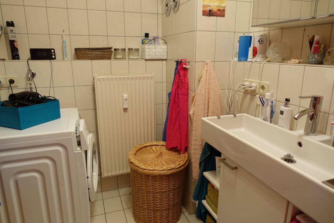 Das Badezimmer ist mit einer Badewanne und einem Waschmaschinenanschluss ausgestattet.