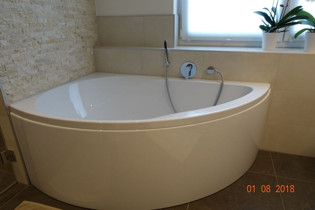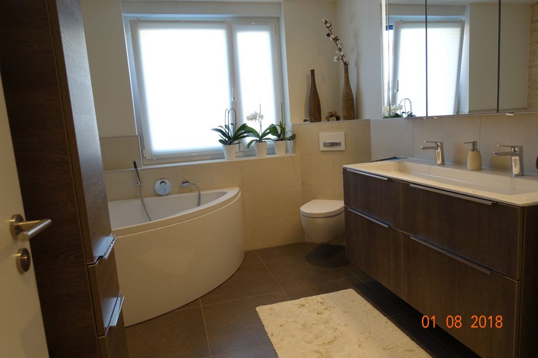 - Tageslichtbad mit Eckbadewanne und bodentiefer Dusche; Waschmaschinen- und Trockneranschluss im Bad, WC, Spiegelschrank, Waschbecken mit Unterschrank