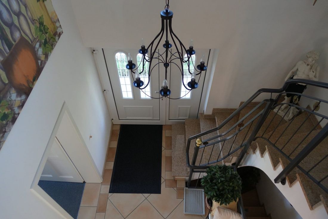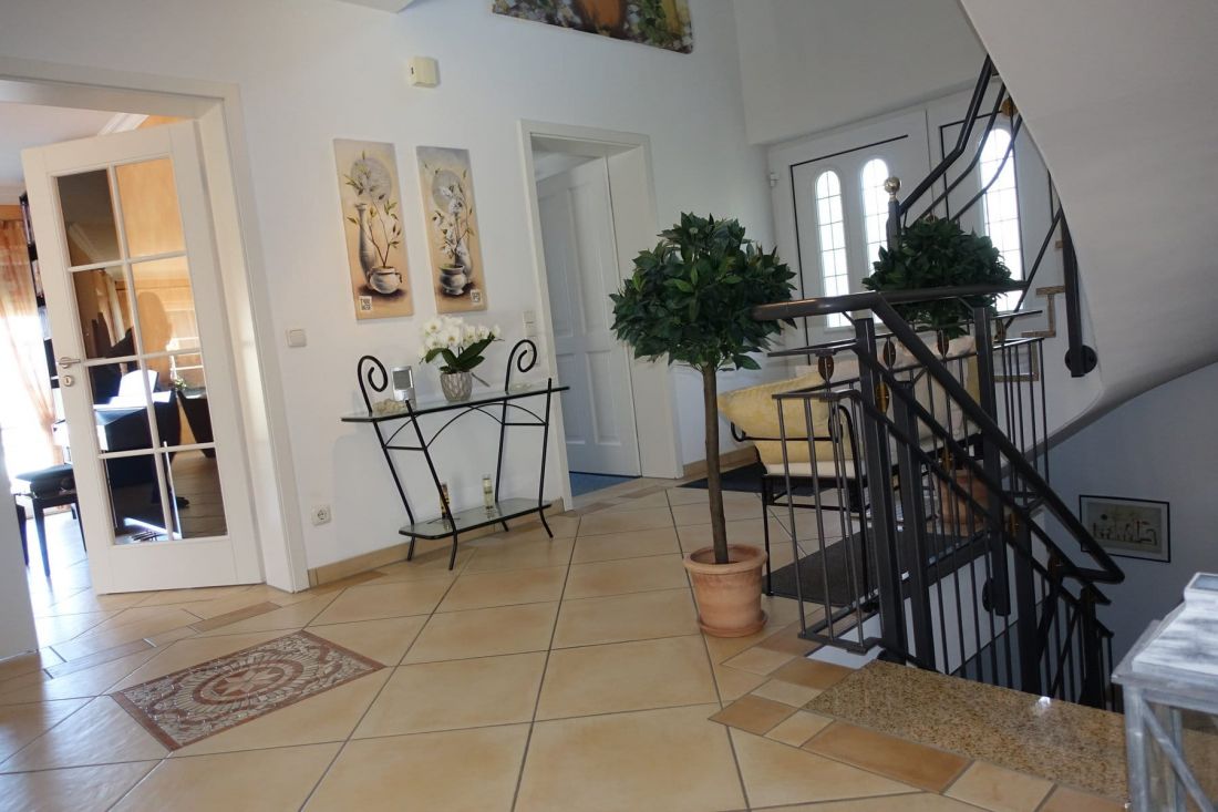 Bei Betrachtung des Interieurs treten diverse hochwertige Stilelemente und Baustoffe wie exklusive Bodenfliesen, kassettierte Türen und eine umfangreiche Elektroinstallation hervor. Neben der großzügigen Raumgestaltung auf beiden Wohnebenen bildet der Eingangsbereich mit Diele, der Galerie und dem Treppenaufgang ein Highlight der Immobilie. Eine auf der Loggia angelegte Terrasse ist von zwei Zimmern des Obergeschosses aus begehbar.