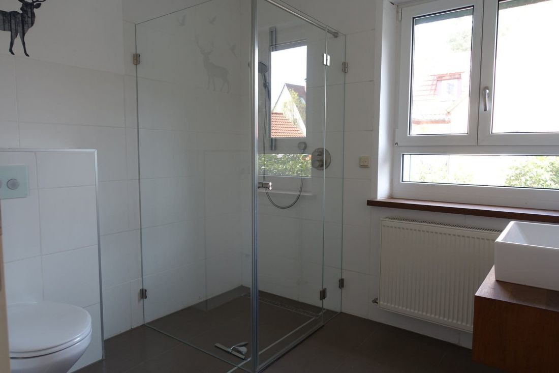 - Duschbad mit WC (Tageslichtbad) und Decken Einbaustrahler im Erdgeschoss, Glasduschabtrennung