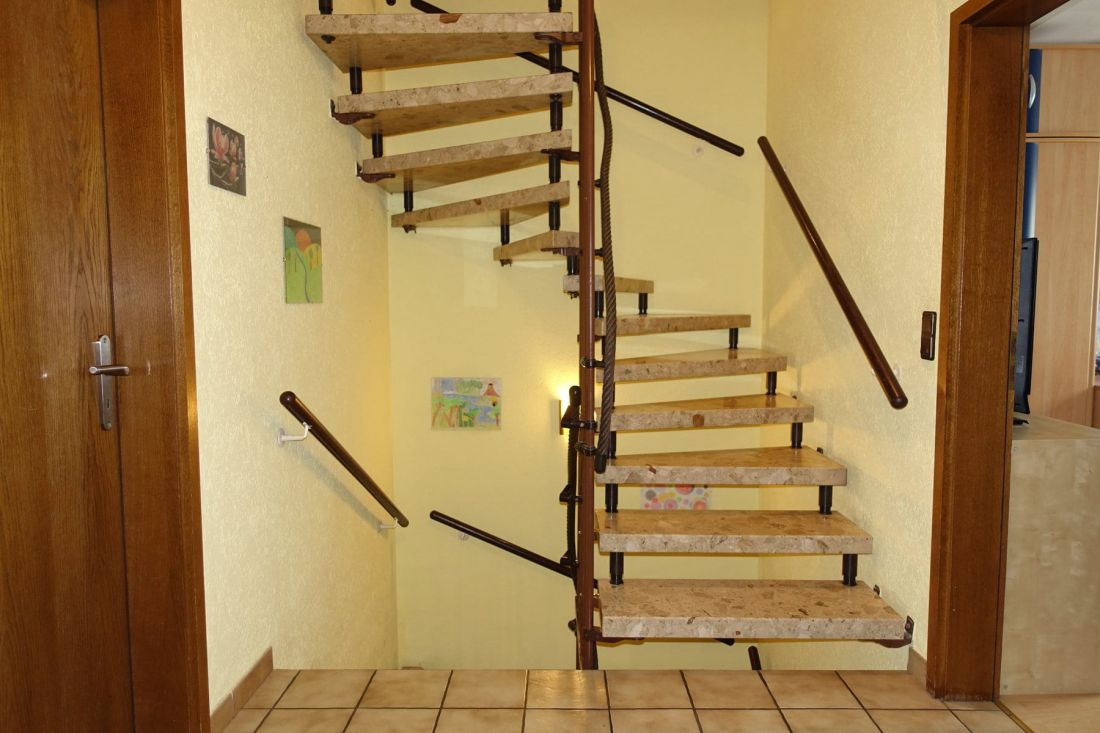 Entrée, Küche und Esszimmer sind mit Granitfliesen ausgestattet, das Wohnzimmer mit Parkettboden. Ein Kaminofen in diesem Geschoss sorgt bei Bedarf für eine angenehme Wärme.