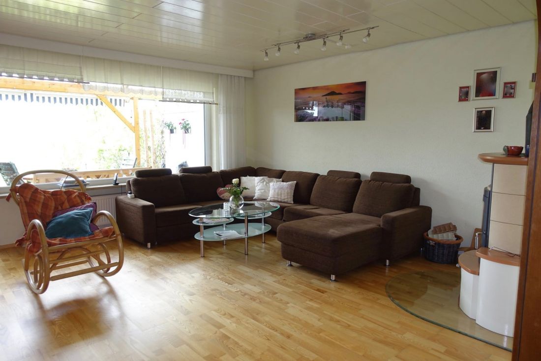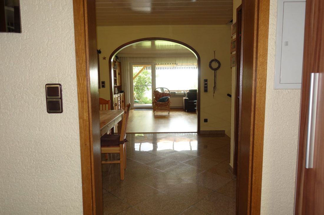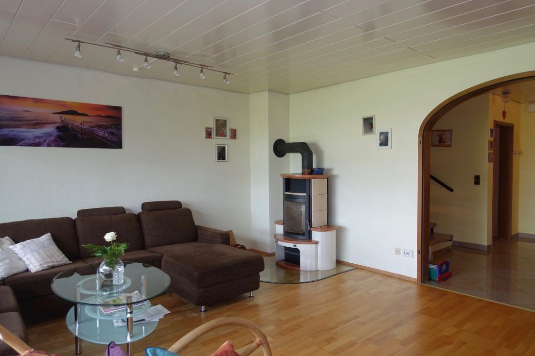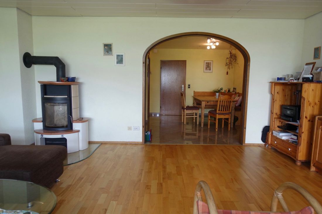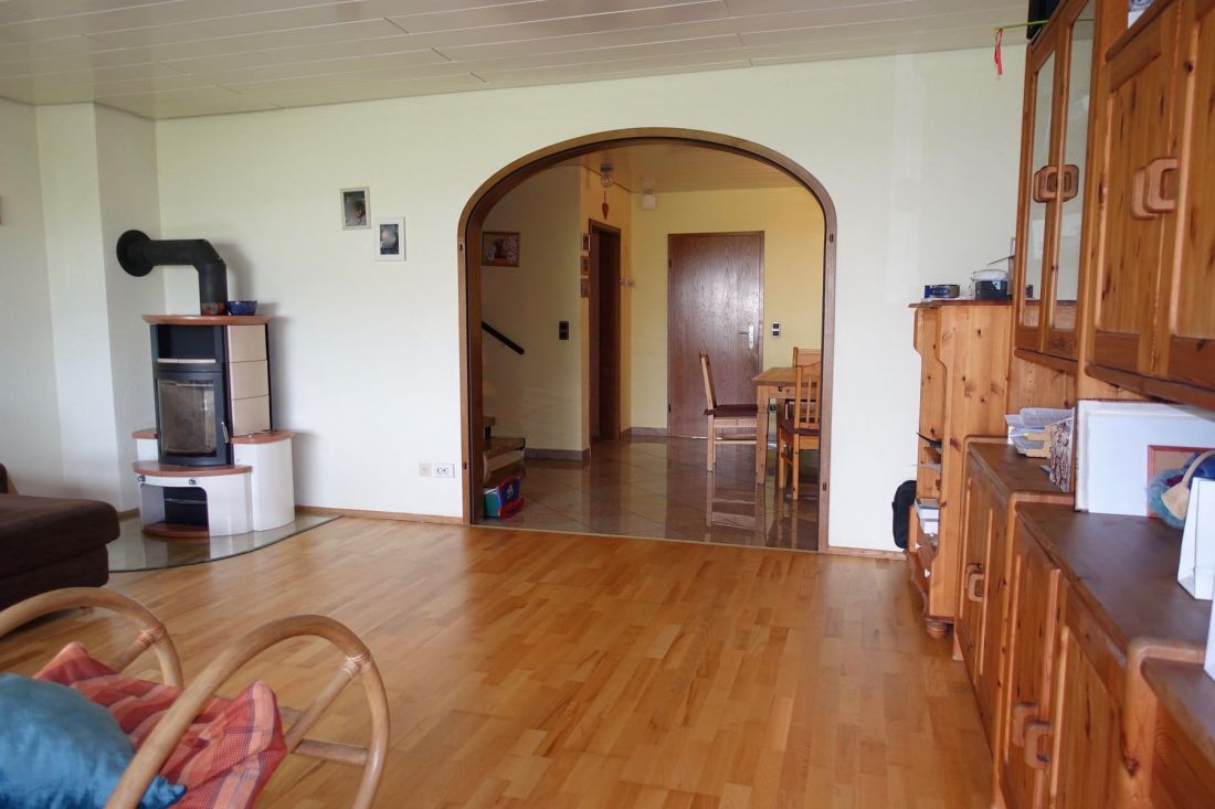 Über das Entrée mit Gäste-WC und Garderobe gelangt man in in den großen Wohn- und Essbereich mit Kaminofen und Zugang zu überdachter Terrasse und Garten.