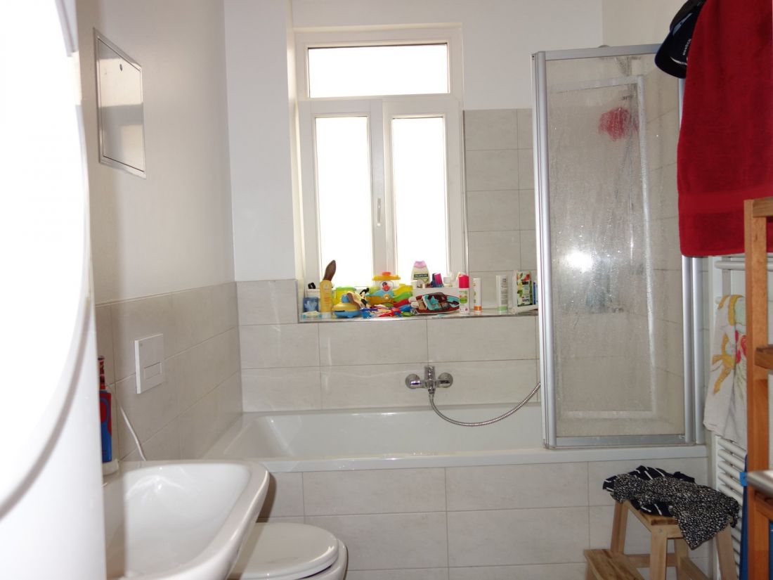 - Tageslichtbad mit Badewanne und Waschmachinenanschluss (Duravit-Sanitärelemente)