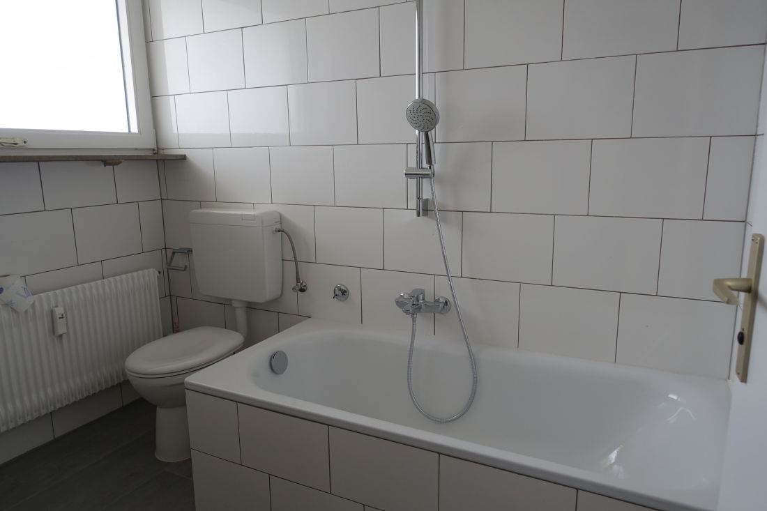 - renoviertes Badezimmer mit Badewanne, WC, Waschbecken und Spiegel, Glasduschabtrennung