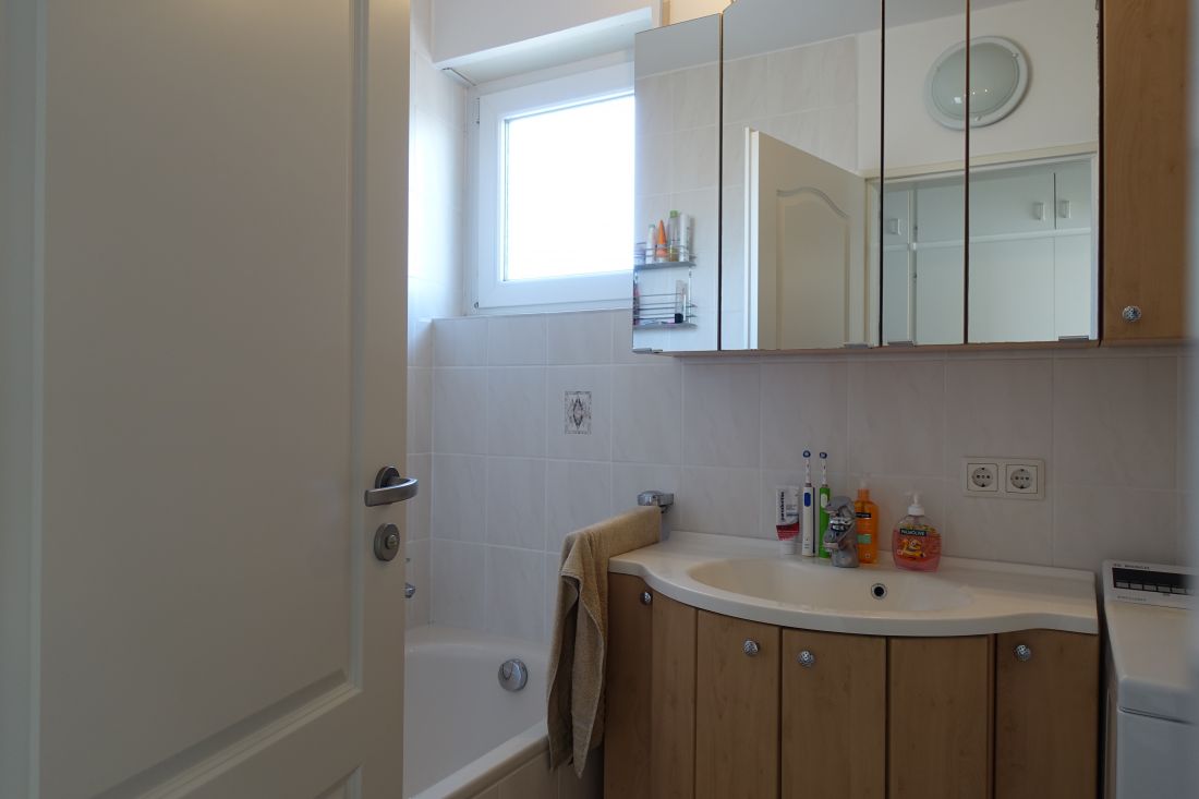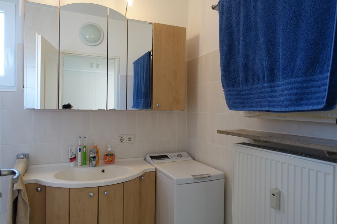 - Badezimmer mit Fenster, Badewanne, Waschbecken und Waschmaschinenanschluss; Badschrank mit Spiegel