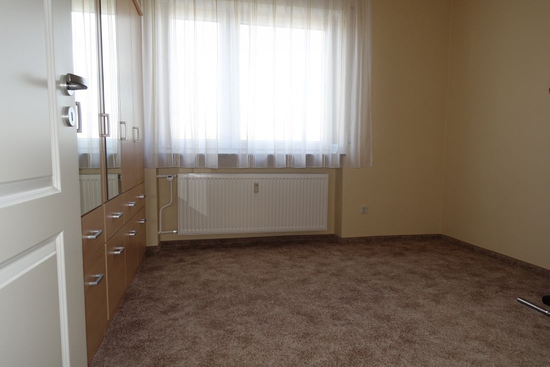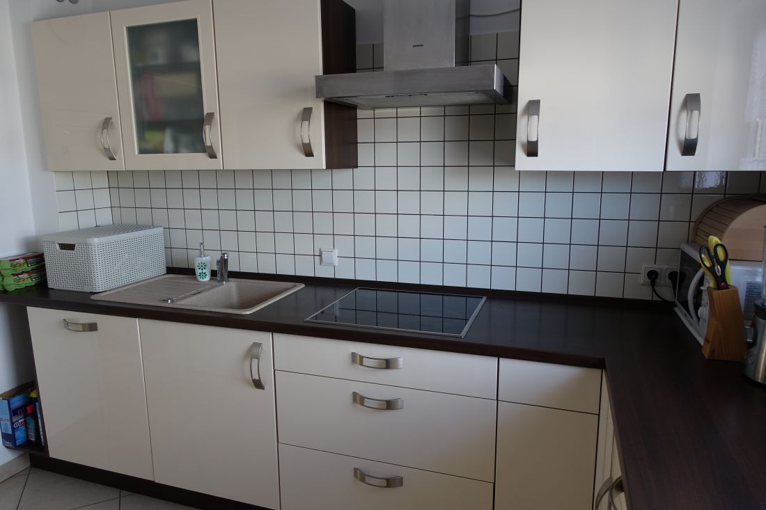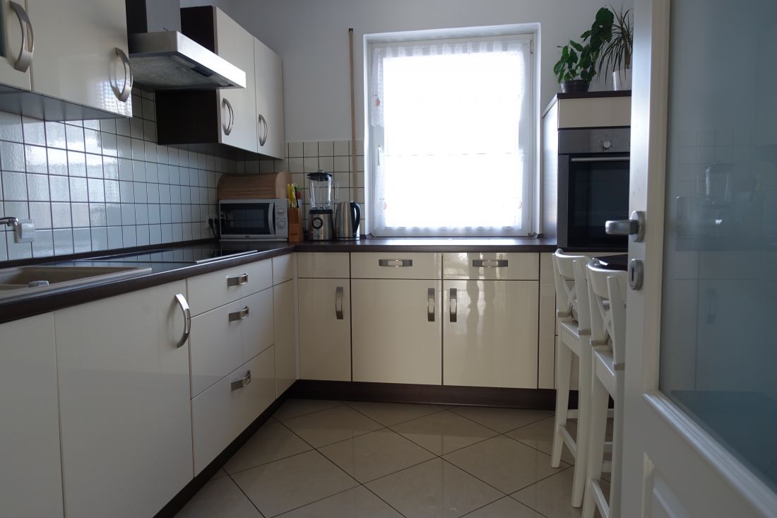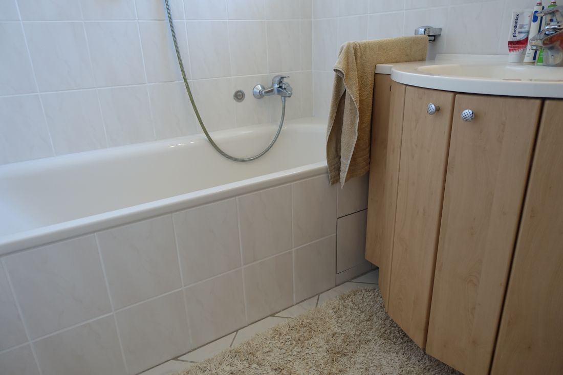 - Fußböden: grauer Laminat in Wohnzimmer, Teppichboden (nicht verklebt) in Schlafzimmer und Kinderzimmer, beigefarbene, glänzende Feinstein-Fliesen in Flur und Küche