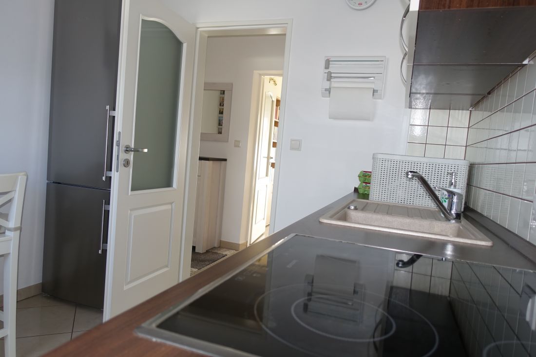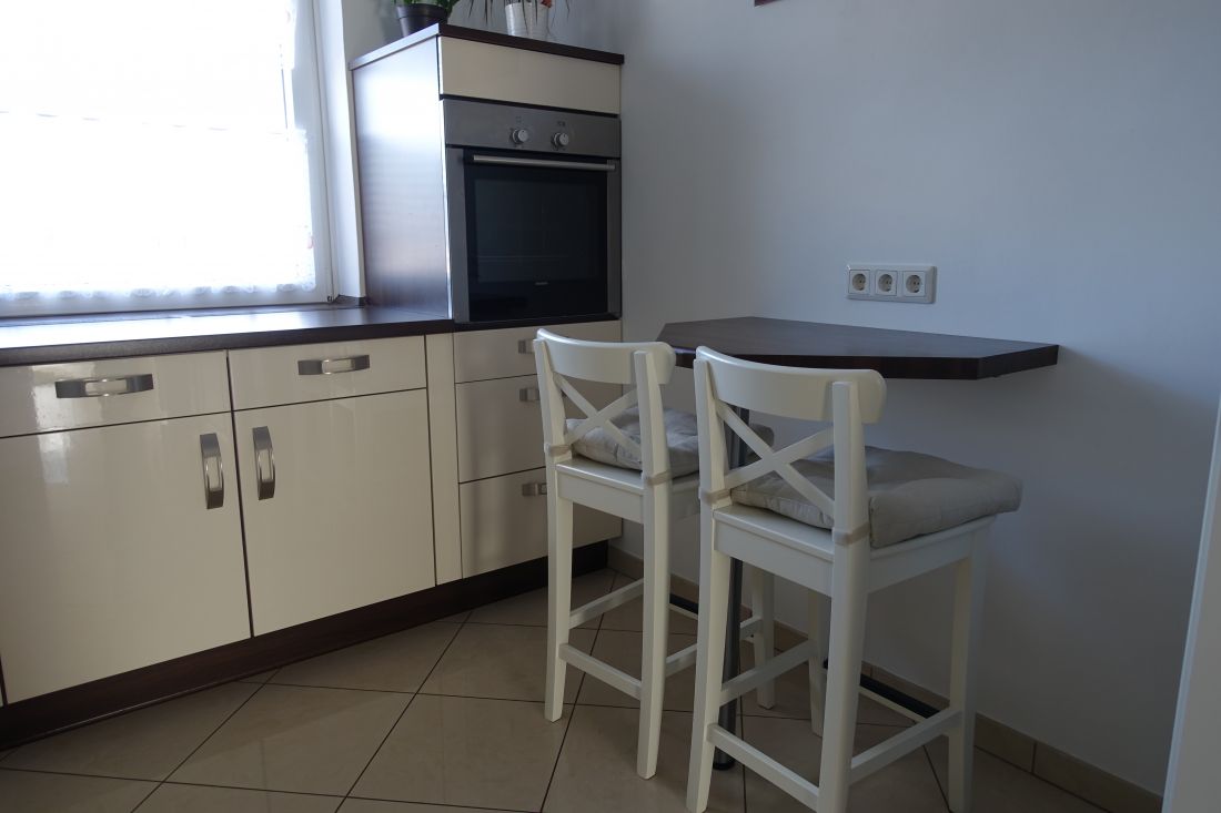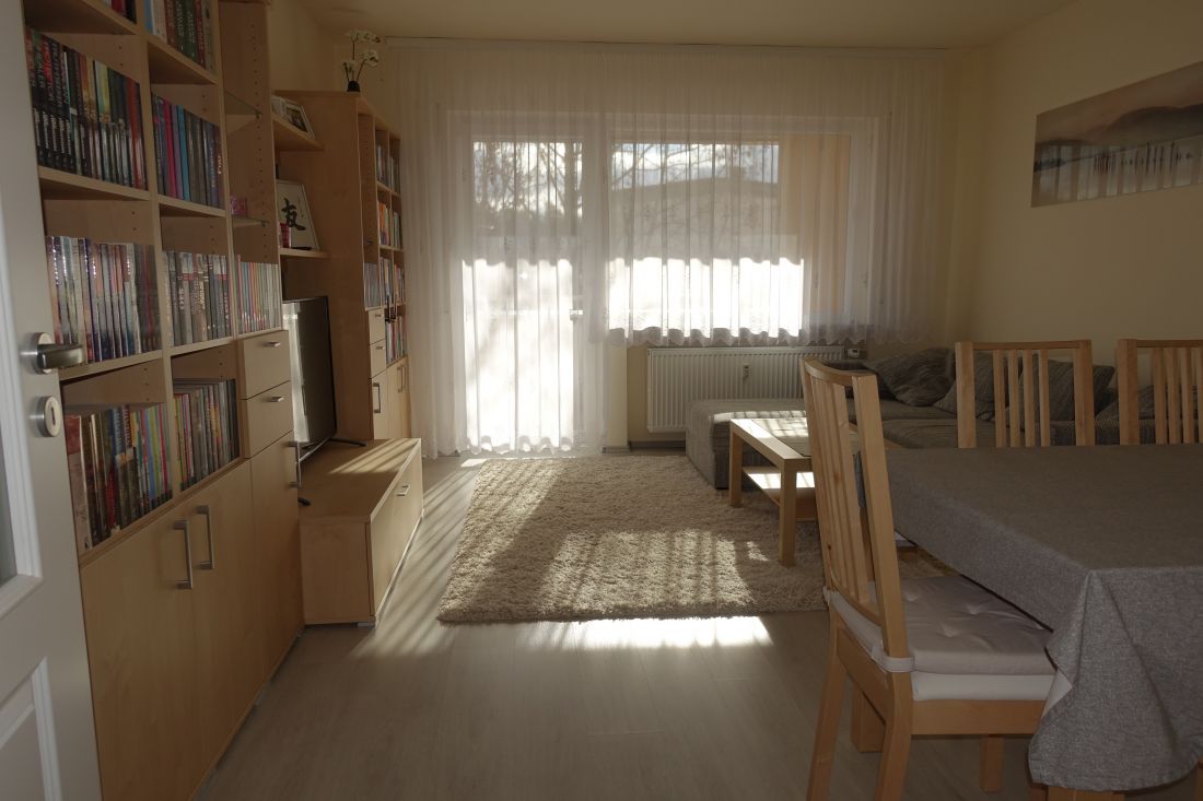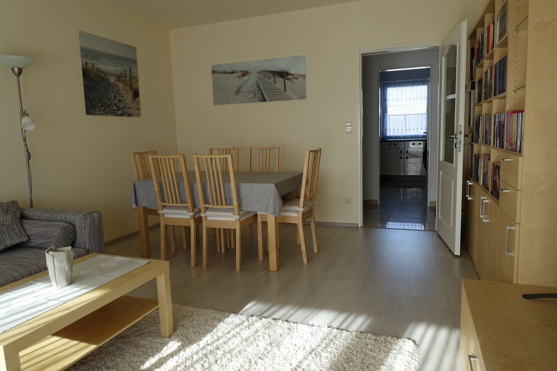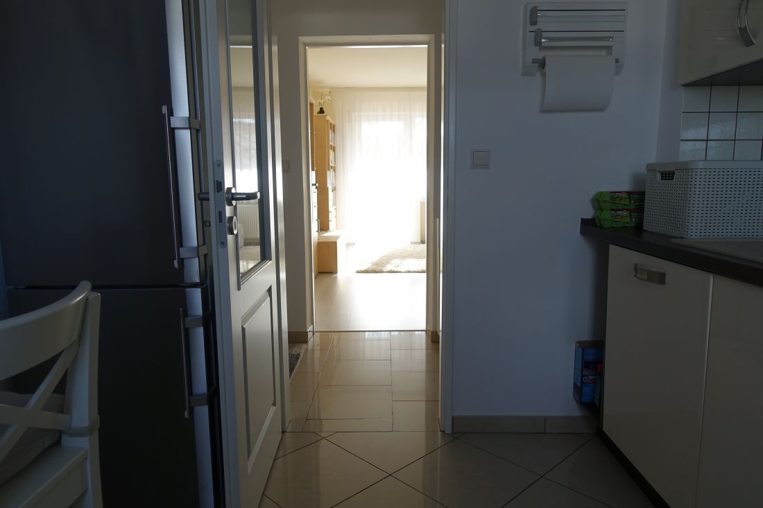 - Fußböden: grauer Laminat in Wohnzimmer, Teppichboden (nicht verklebt) in Schlafzimmer und Kinderzimmer, beigefarbene, glänzende Feinstein-Fliesen in Flur und Küche