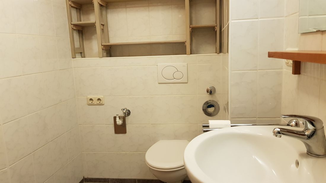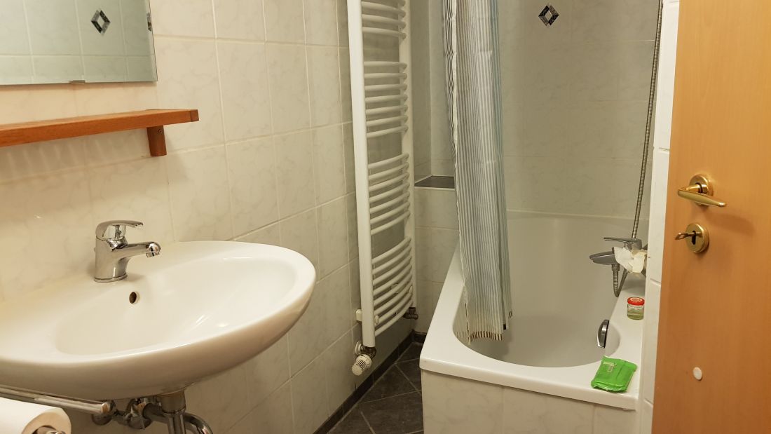 Das Badezimmer (ohne Fenster) ist mit einer Badewanne und einem Handtuchheizkörper ausgestattet. Ferner befindet sich hier der Anschluss für die Waschmaschine.