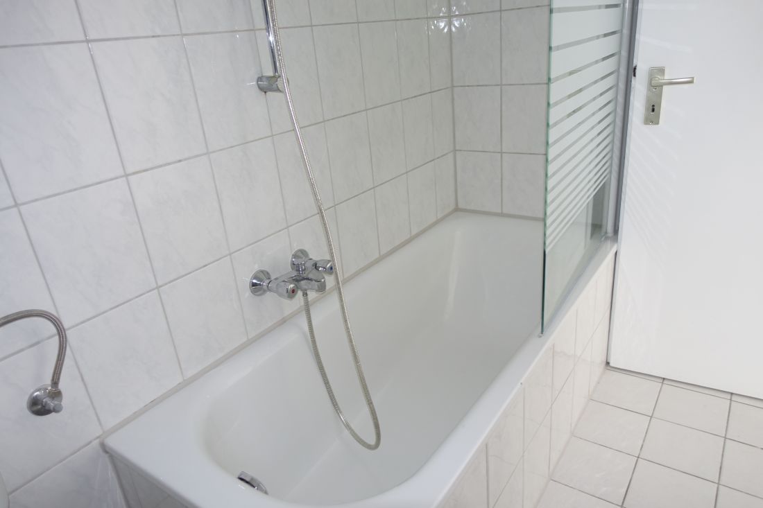- renoviertes Badezimmer mit Badewanne, WC, Waschbecken und Spiegel, Glasduschabtrennung