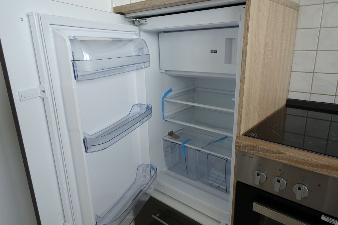 - Einbauküche bestehend aus Ober- und Unterschränken, Herd mit Cerankochfeld, Spülbecken und Dunstabzughaube, Kühlschrank