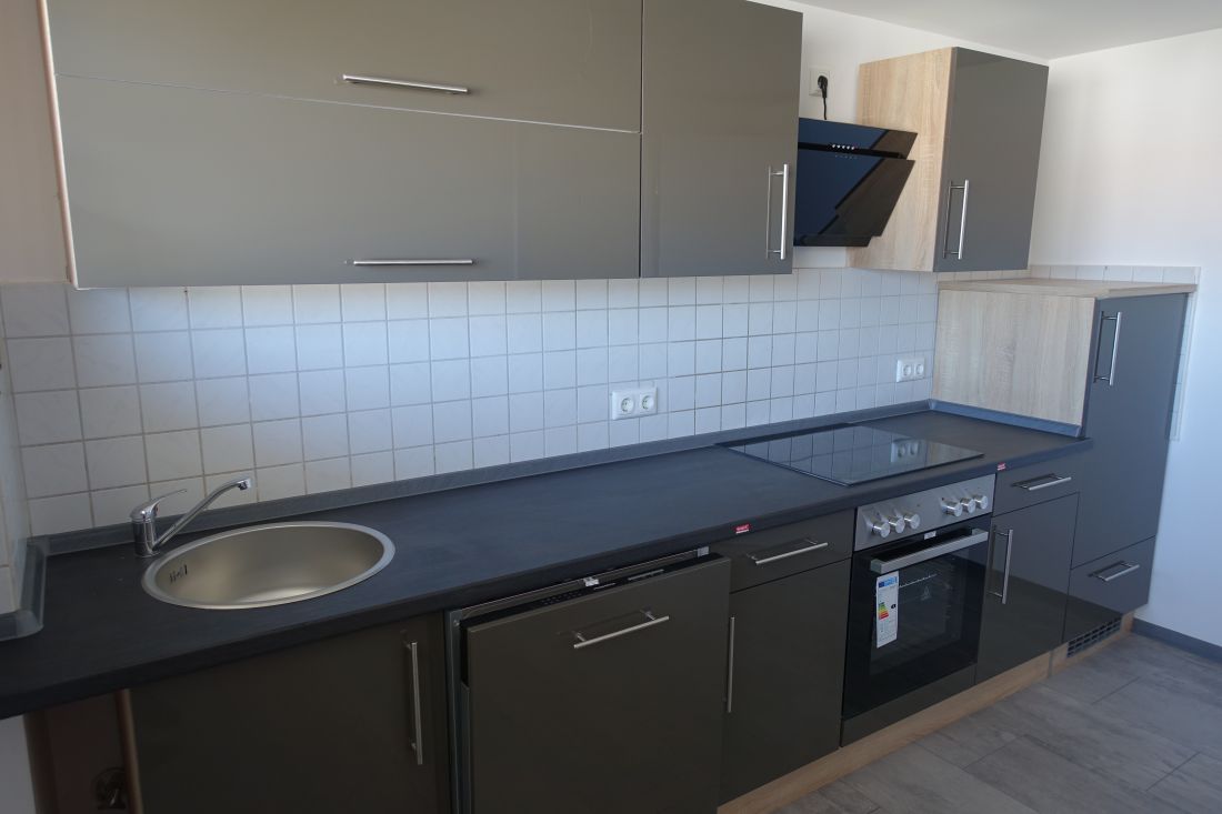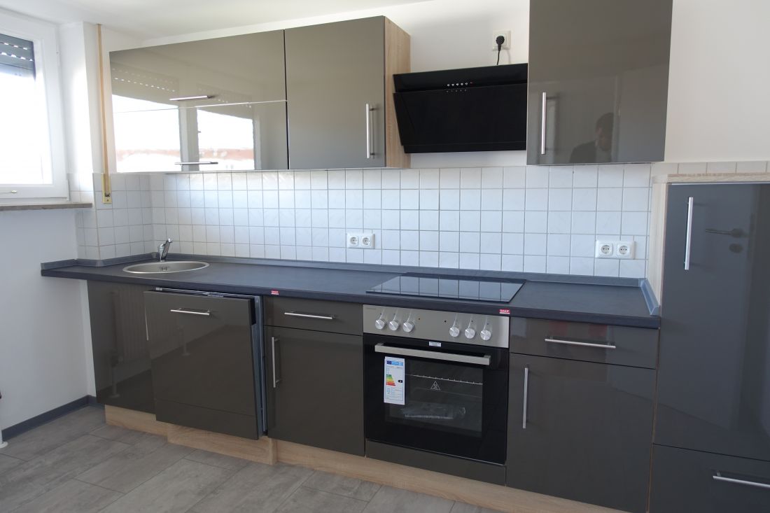 - Einbauküche bestehend aus Ober- und Unterschränken, Herd mit Cerankochfeld, Spülbecken und Dunstabzughaube, Geschirrspülmaschine, Kühl-/ Gefrierkombination