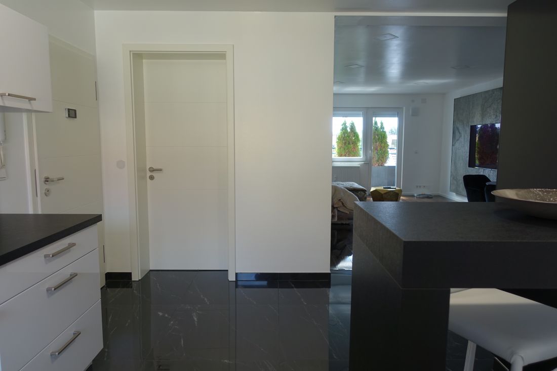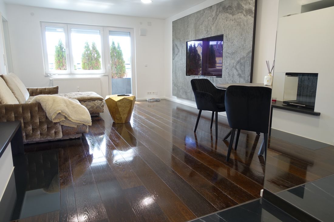 - Holzdielenböden: Eiche kerngeräuchert, hochglanzlackiert