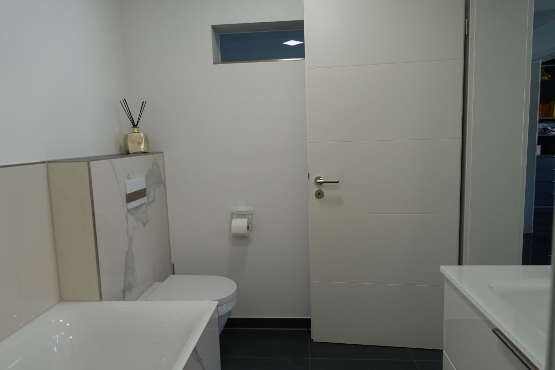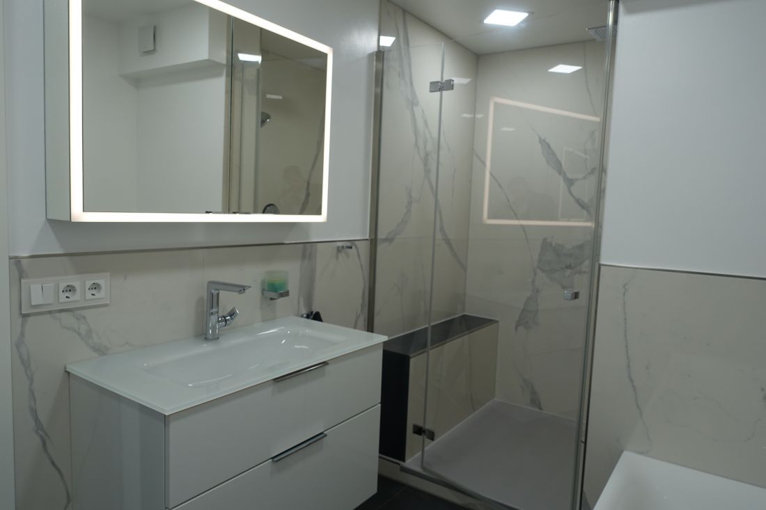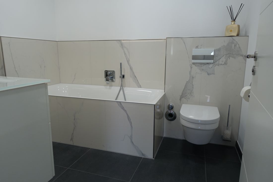- Bad in Marmor Optik, Stahl-Badewanne, Unterputz-Armaturen, Raindancedusche, Glasduschabtrennung, Waschbecken und WC, flache Duschwanne im Sondermaß, rutschhemmend aus glasiertem Titan-Stahl (Hersteller Bette)