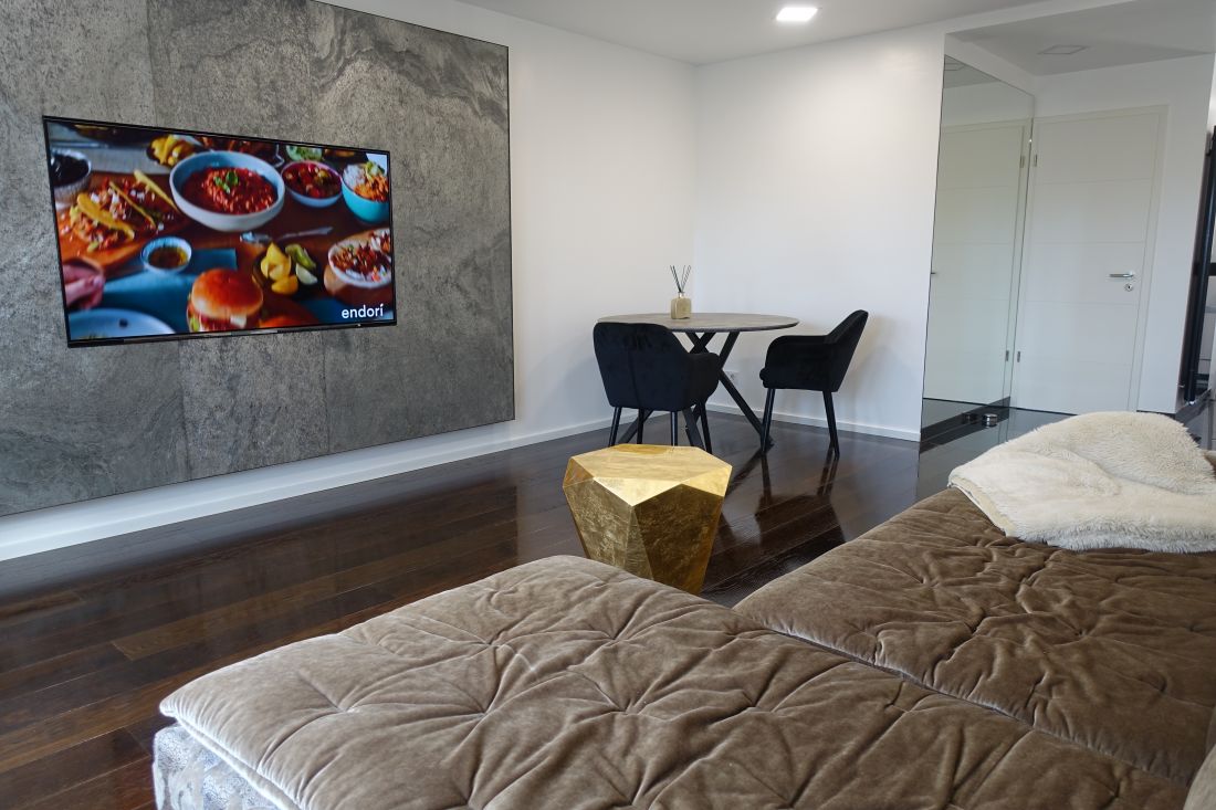 - Fernsehwand aus indischem Dünnschiefer mit LED-/RGB Beleuchtung und integriertem Flachbild-Grundig Fernseher.