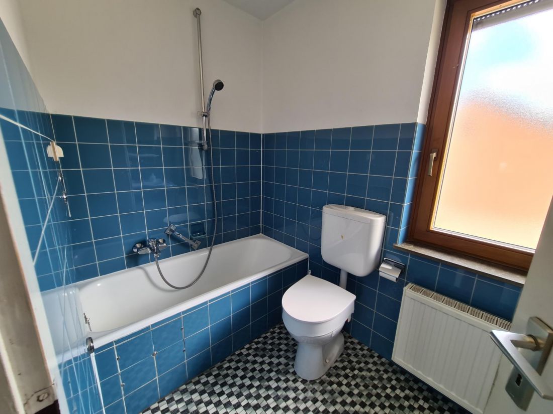 Im 1. Obergeschoss befinden sich neben einem Badezimmer mit Badewanne und WC drei weitere Zimmer. Vom Schlafzimmer aus begehbar ist ein nach Südwesten ausgerichteter Balkon mit Blick auf den Garten.