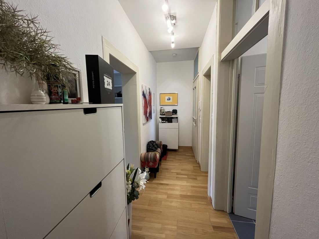 Die Wohnung ist aufgeteilt in zwei Zimmer, eine Küche mit Balkon, ein großes Tageslichtbad mit Badewanne, Dusche und WC, einen Abstellraum und einen Flur.