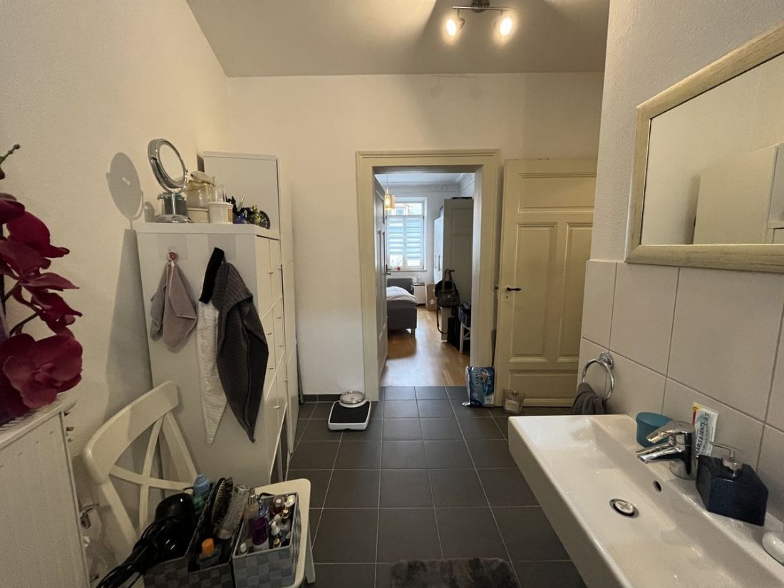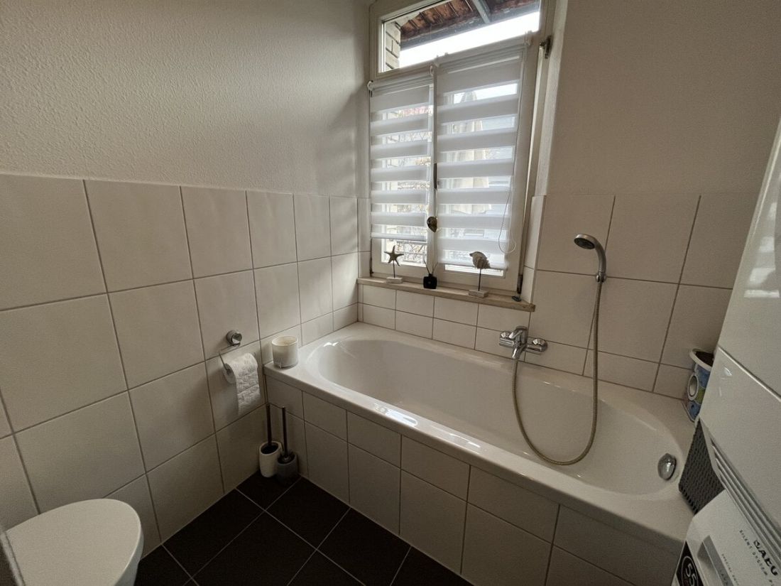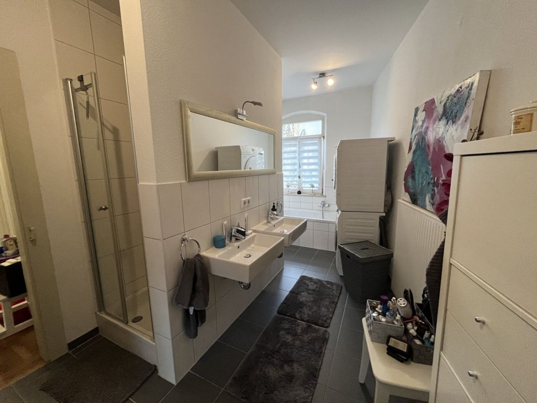 - Tageslichtbad mit Badewanne (Acryl), separater Duschkabine, WC, zwei Waschbecken und Waschmachinenanschluss