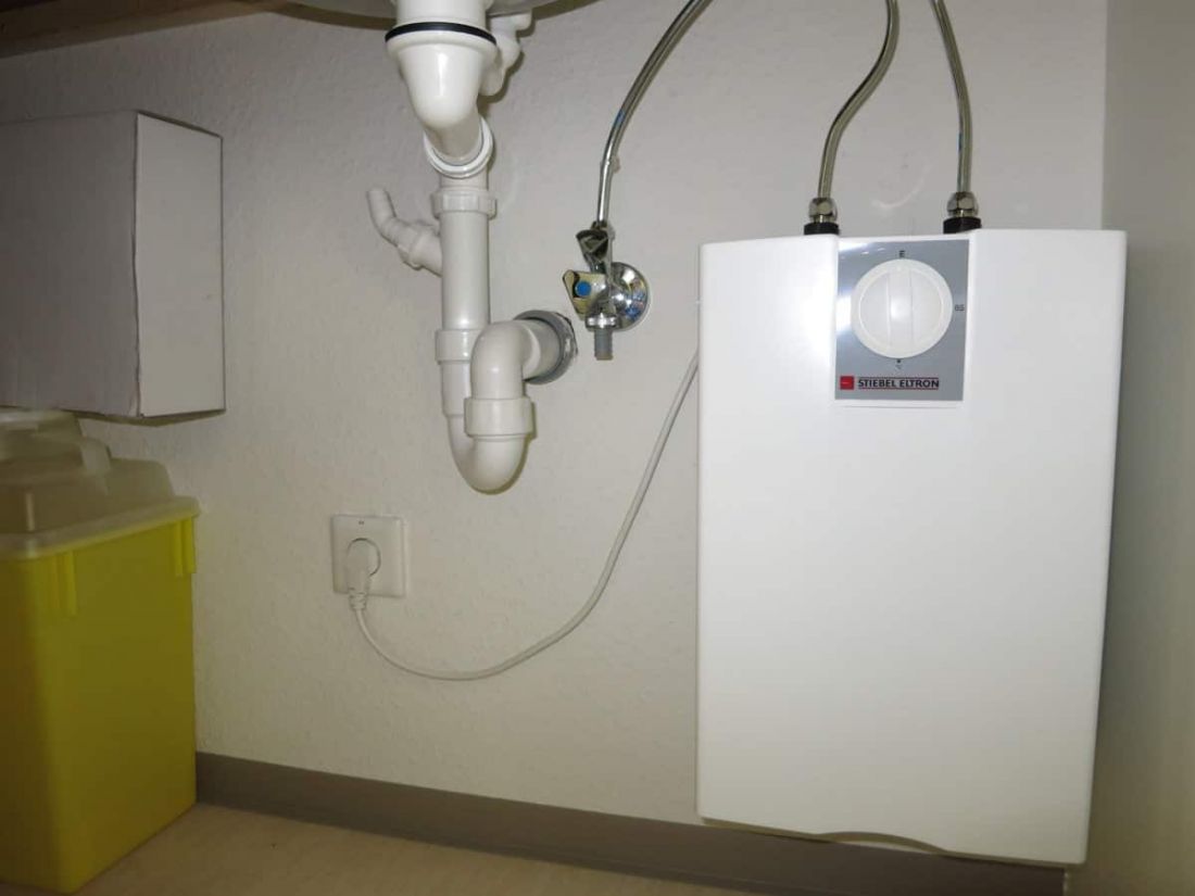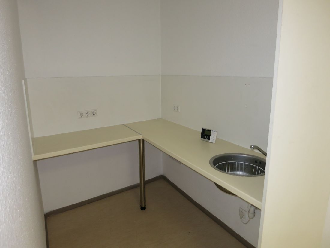 - die Installation eines neuen Waschbeckens mit Sensorarmatur und weißem Fliesenspiegel sowie von Wasserzählern (Anschlüsse für Teeküche vorhanden)