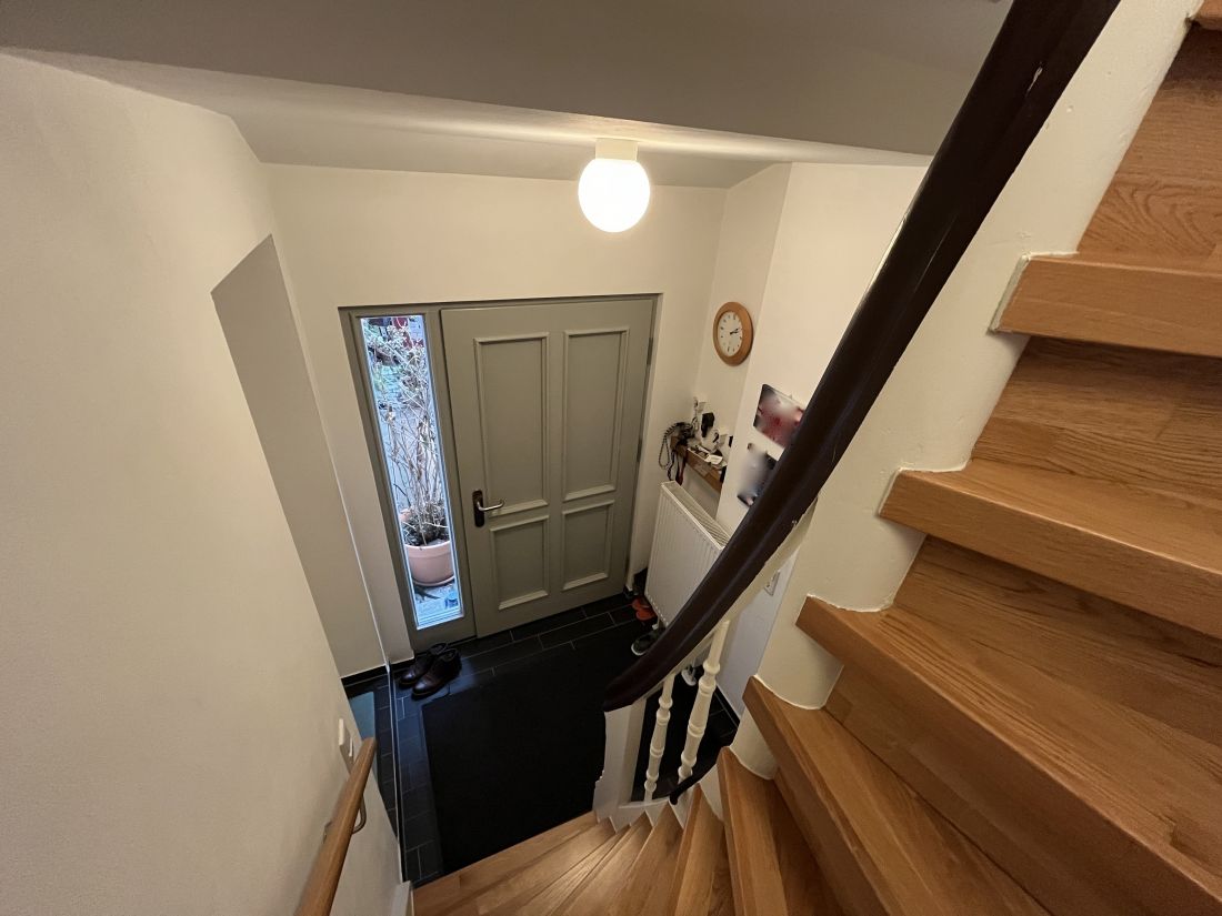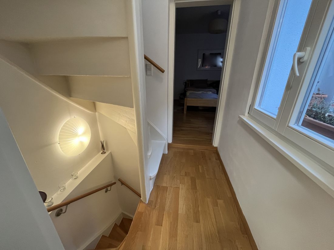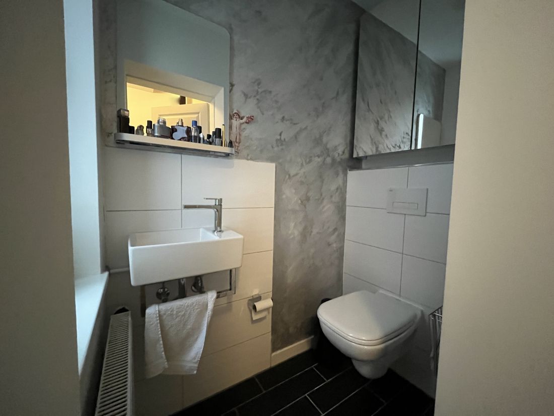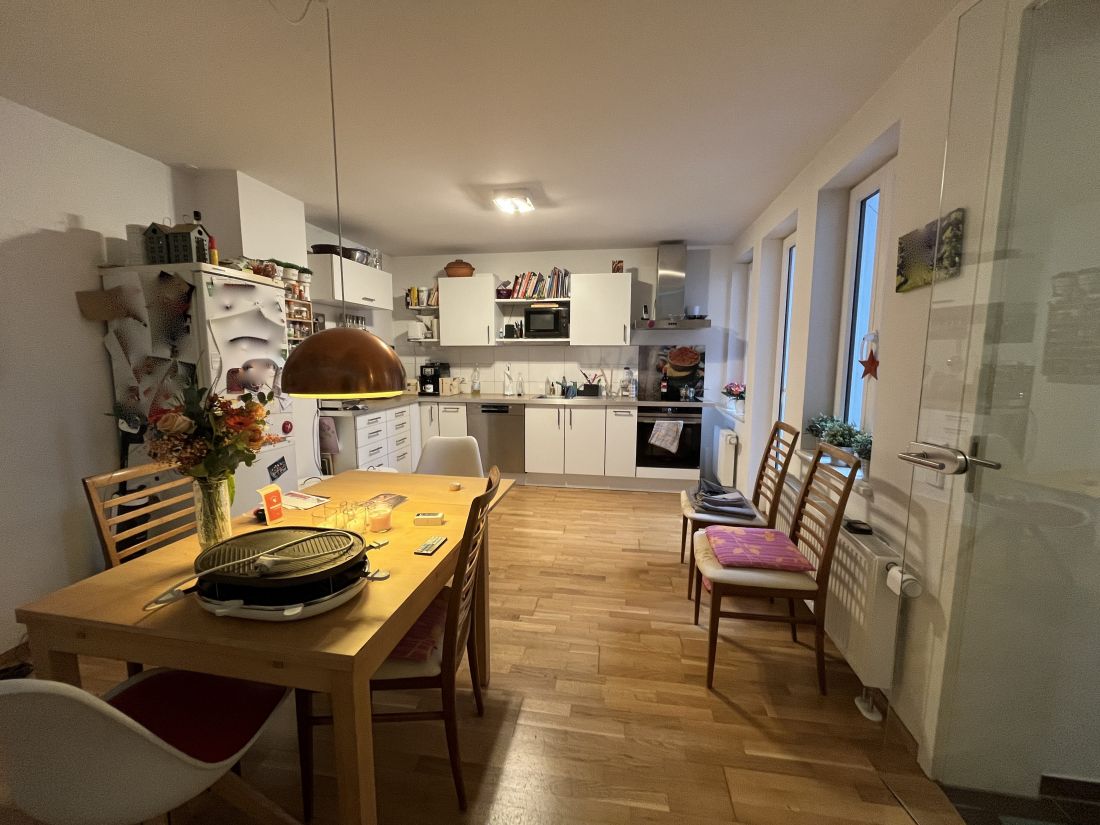 Das Erdgeschoss ist aufgeteilt in eine kleine Diele, ein WC und eine Wohnküche mit Zugang zur im Innenhof des Anwesens gelegenen Terrasse.